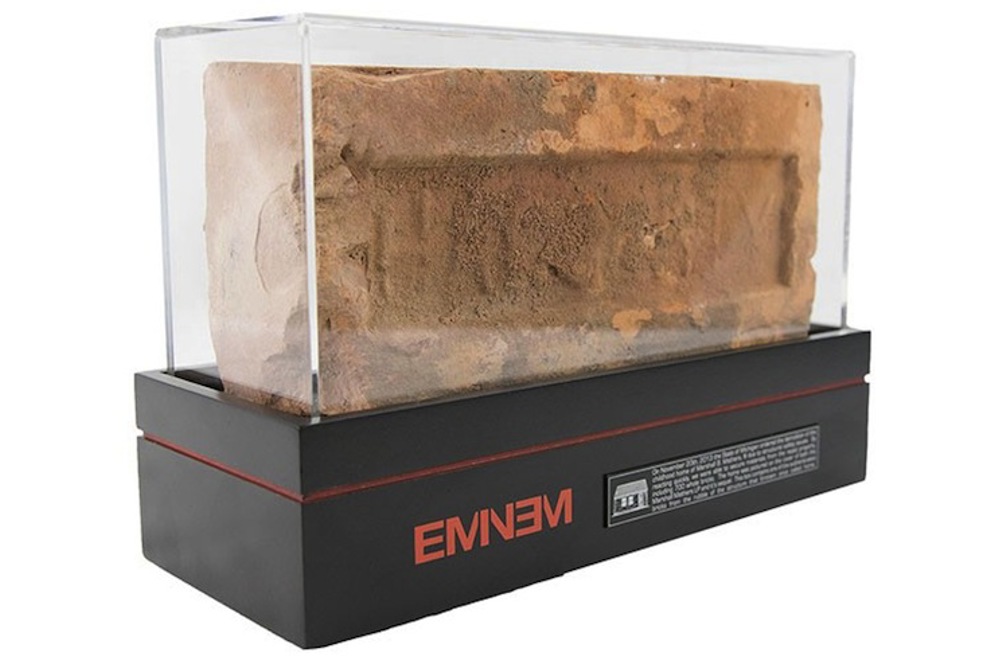 Eminem's childhood home on Dresden Street in Detroit was demolished by the State of Michigan back in 2013 due to structural issues, and the rapper decided to hold onto a bunch of the bricks and woodwork for safe keeping. So, to coincide with TMMLP's 16th birthday, you can now purchase dog tags made up of panels of wood from the rapper's home, as well as bricks that made up the walls. Each dog tag is stamped with Shady's name and address and the bricks come with a display stand and commemorative plaque, along with an authenticity certificate signed by the man himself. The bricks (limited to 700) come in at $313 US; which isn't too shabby for a big piece of rap history.
