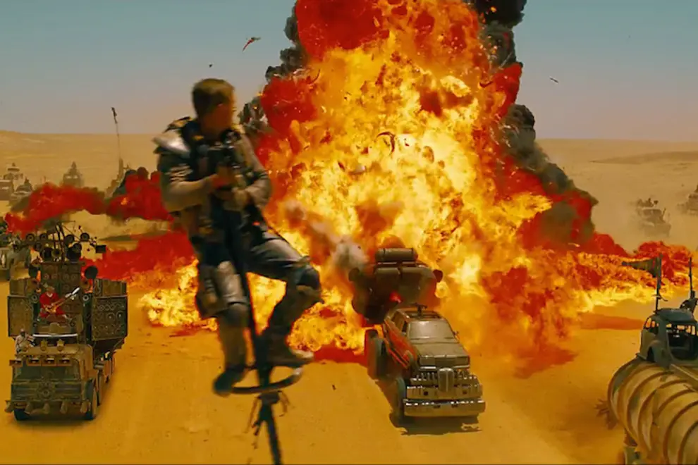 And what a chase it is. The absence of (or well-blended mix of practical and) CGI is made up for horde of mis-matched vehicles, endless desert and a shitload of explosions. The action that accelerates out of this pandemonium is liquid smooth through some clever frame rating fiddling. And in doing so Mad Max: Fury Road side-steps the problem of audiences who couldn’t catch what happened in an action scene. By dropping the frame rate and then speeding it up to normal it keeps the pace going. But the frame rate isn’t dropped so much so that Charlize Theron looks like she is kicking arse in slow motion like a B-grade Kung Fu movie.