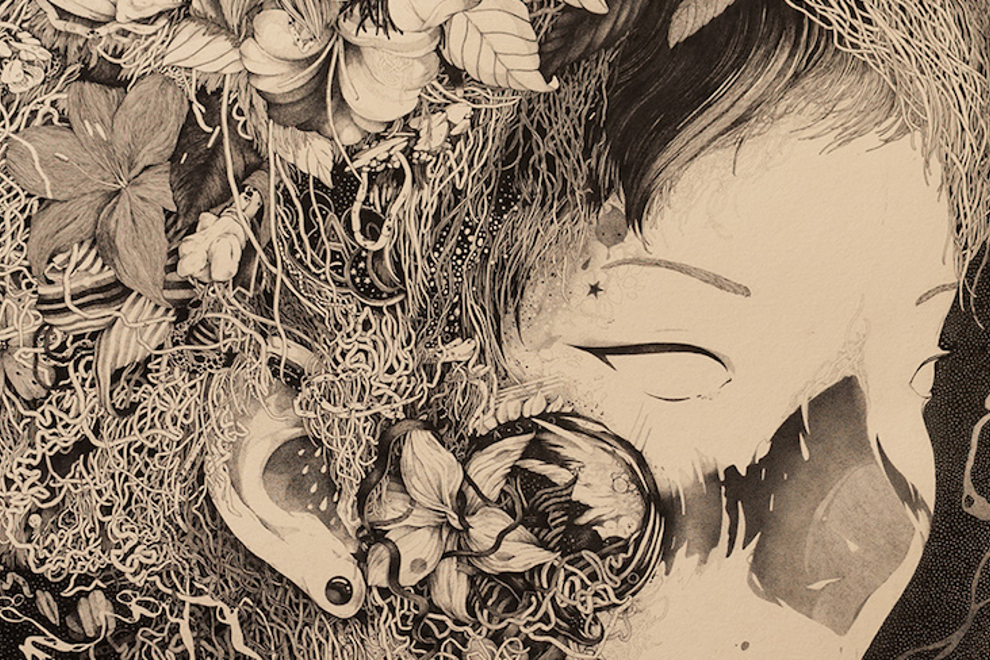 Benze is a Hungarian artist based in Budapest, whose striking and intricate ink illustrations are inspired by the stippling patterns of tattoo design. His floral and haunting compositions often merge natural subject matter with twisted depictions of the human form, leaving each artwork open to interpretation.