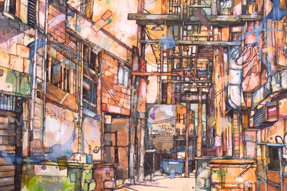 Jon Shaw is a graphic designer-turned-artist based in Vancouver, combining drawing and watercolour painting to create a unique style of art. His pieces can be identified by their layered appearance and distinctive subject matter, usually featuring streetscapes full of buildings, laneways and storefronts. He finds the elements involved satisfying, describing the process as "a series of expressive and uninhibited paint, collage and texture applications" from which he crafts a basic structure for the detailed illustrations, before adding and retracting various aspects of design and colour until each work feels harmonious.