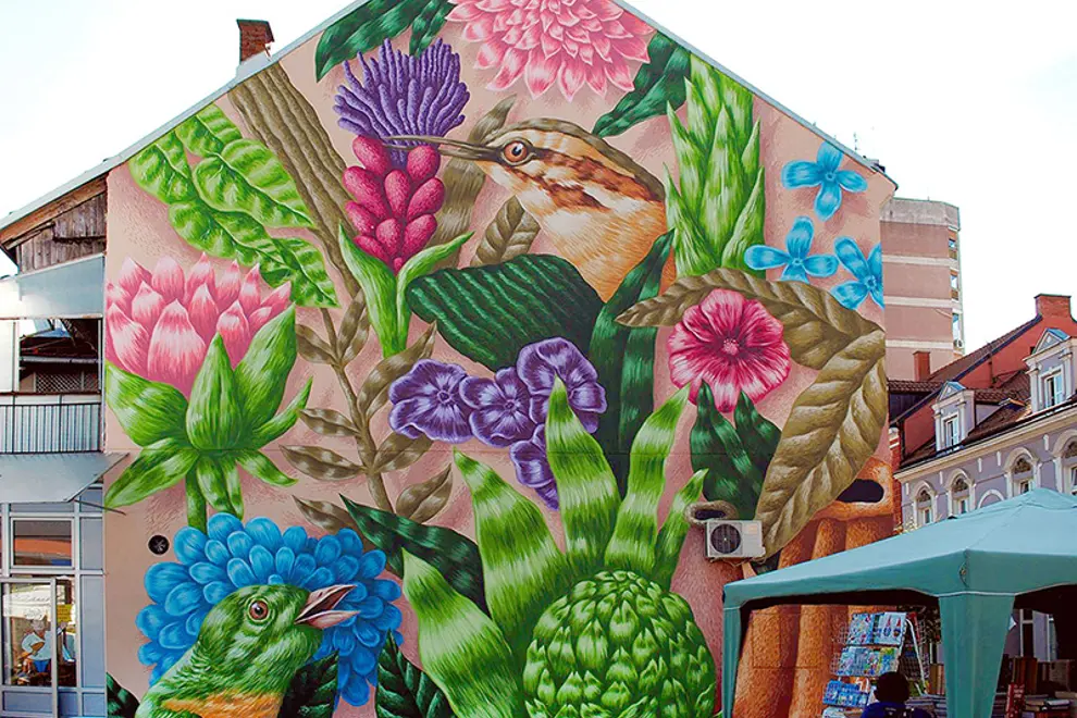 Saddo is a Romanian artist, illustrator and muralist whose work often deals with themes of nature, mythology and mortality. A prominent street artist, Saddo was the founder of early Romanian street art collective The Playground - a move he describes as one that opened doors. His works are stunning pieces of pop surrealism, and echo consistent motifs: flowers, leaves and plants are common, while darker imagery like skulls, coffins and haunting fantasy creatures are recurring. Each of these elements are tools in Saddo's creation of an atmosphere within each painting, balancing tones and creating meaning to reflect his own moods. Over the past two years, his solo shows Rise of the Bird People and A Stranger in the Garden have earned him attention in the world of contemporary art, where his large-scale public pieces and lush style truly stand out.