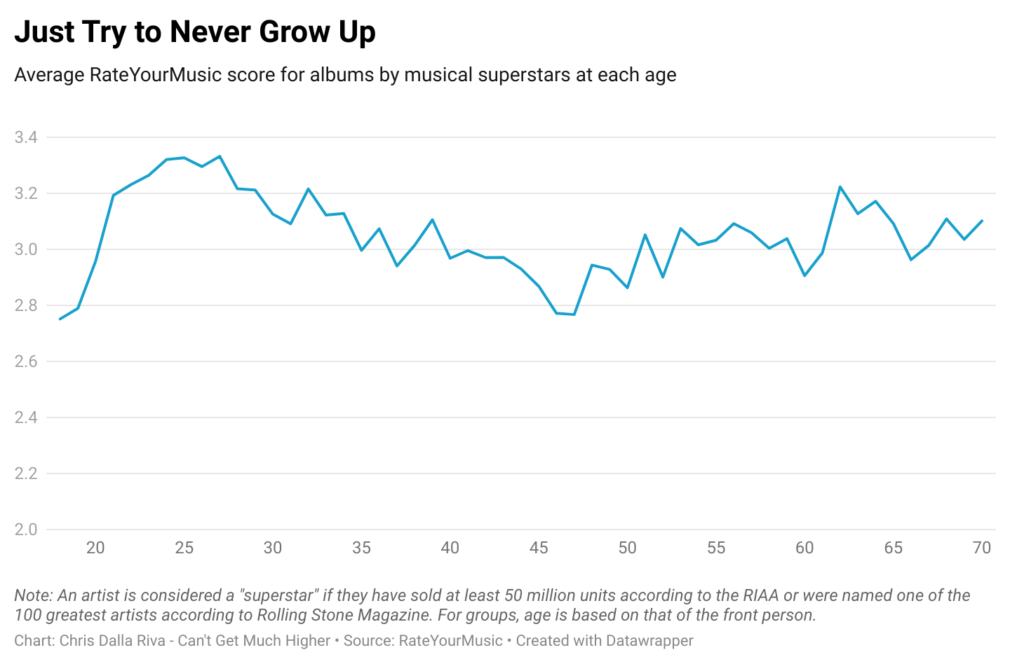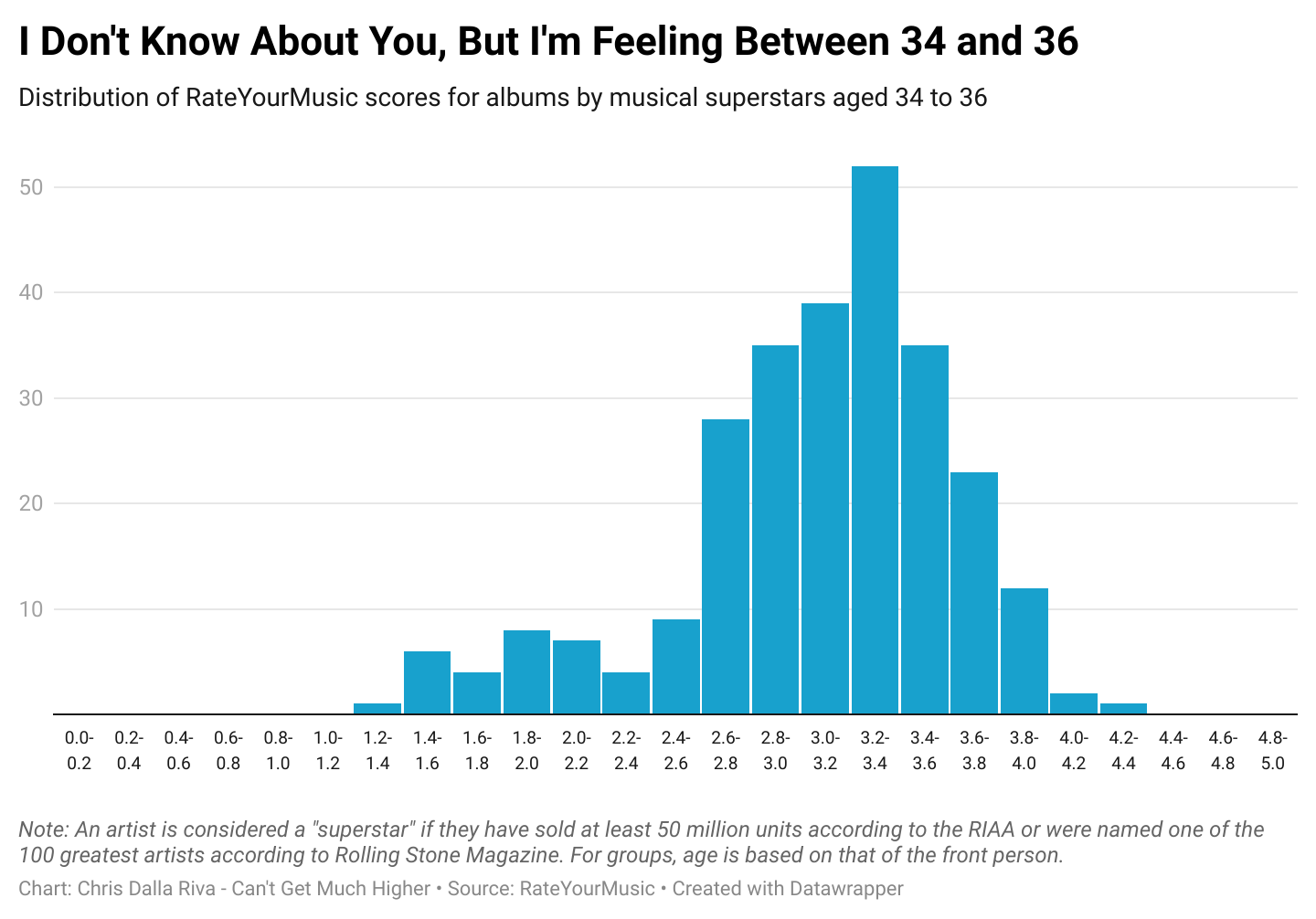 But we can also check this. Rather than just limiting this analysis to albums released by superstars between 34 and 36, we can look at every album these esteemed artists released. When we do that, we see a fascinating trajectory for album quality.