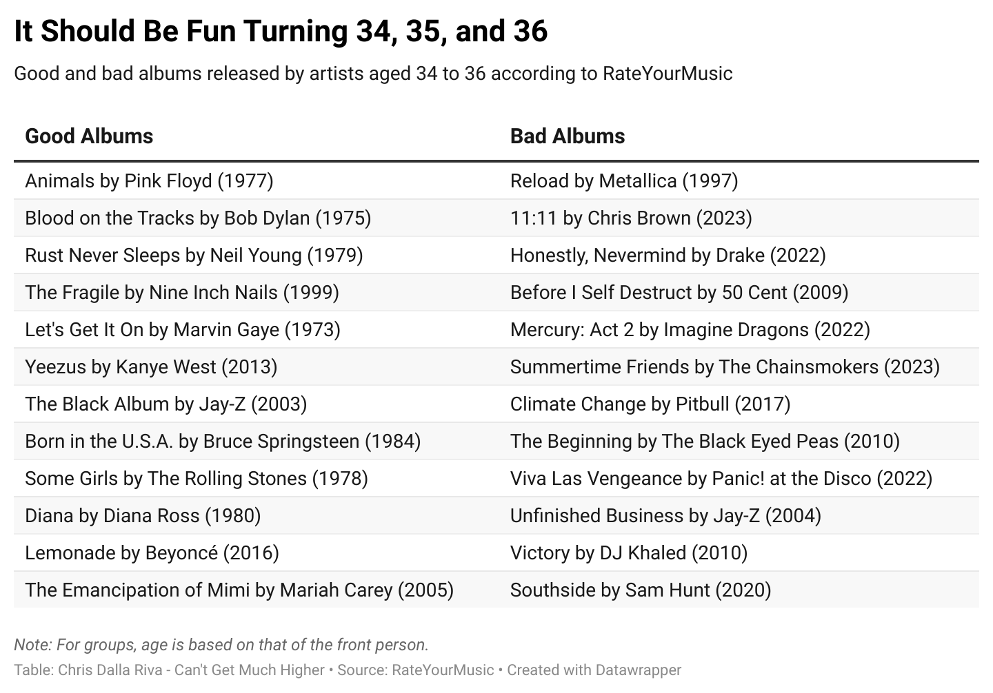 To make things a bit more concrete, I think it’s helpful to see specific examples of what other superstar artists were releasing in that age bracket. Yes, there are some classics and some clunkers. But what most struck me the most about trawling through these albums was how often the vast majority were were forgettable even if they weren’t notably bad.