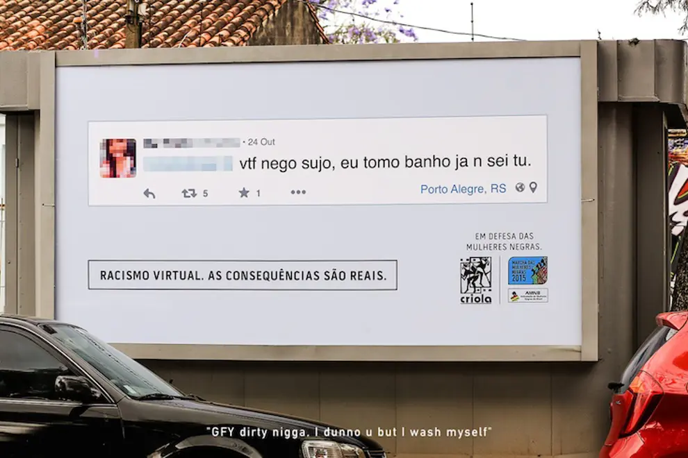 In Brazil a group called Criola have come together to highlight the impact online racism has on people and how it's just the same as saying it in person. Criola's mission statement describes them as an, "...organization founded in 1992 and led by black women. It works to defend black women rights, in a cross and integrated perspective." This campaign came in response to the large amount of racial abuse Maria Julia Coutinho, a weather report on the largest TV show in Brazil, experienced online in July 2015. Maria Julia Coutinho is also the first black reporter on prime-time TV in Brazil. Out of that Criola began to gather hateful comments, located where the comments came from and bought billboard spaces for put up the comments in the areas they were published. And while anonymity was guaranteed I think it's a damn good way to kick it to people who racially attack other people online. You can watch a video below of looking at the campaign: