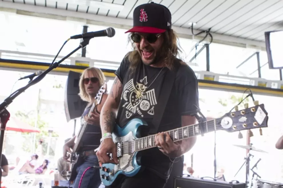 Darting our eyes back over to the stage, there stood bassist Magic Jake decked out in Burger Records threads and badges, Tommy Tom Toms back centre at his kit and Kyle Thomas - also known as King Tuff - fashioning a shit load of badges and patches on his denim vest, as well as his sacred sun medallion fastened around his neck.