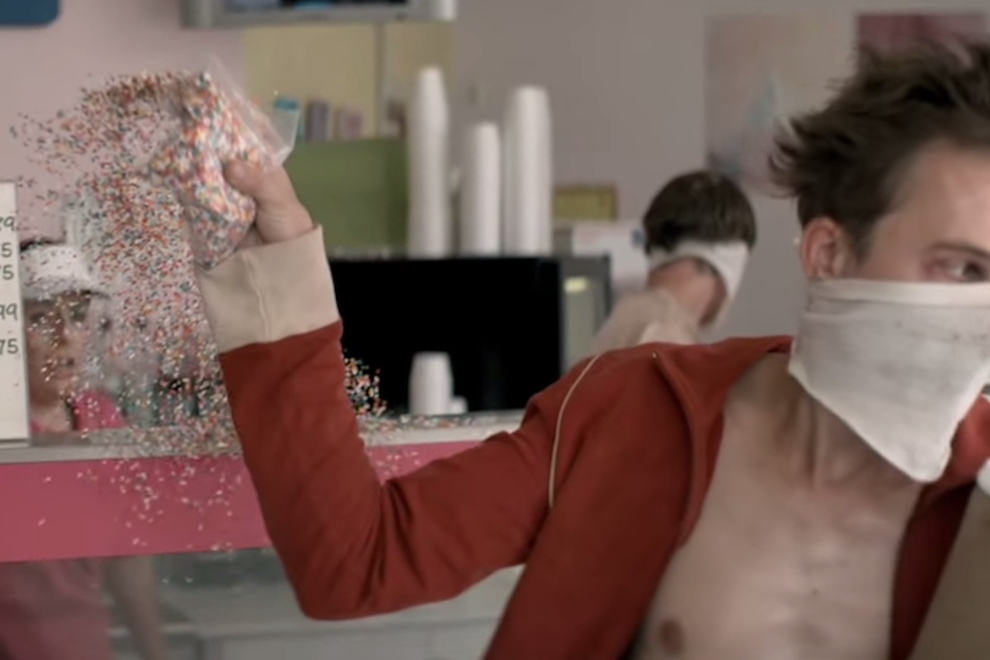 The video is directed by Tim K. Its narrative centres upon a riff-raffish group of strapping young men, living in derelict quarters, itchy for their next hit... of icecream. Cue high-speed heist at the local icecream parlour. The bright colours of the icecream they loot stands out in stark juxtaposition to the dark, dirty colour palette that depicts the boys and their street surrounds. The robbery action is juxtaposed with more pristine studio scenes: Alison Wonderland (all hair and eyelashes) sings her track against a candy-pink background, while a well-oiled, Adonis-like male model has a serious amount of colourful liquid shit poured over him. The studio shots have a very Kris Moyes, "abject-body", imaginative, playful kind of vibe (he's the Australian director behind heaps of the Modular stuff, and Sia's Buttons vid), while the teenage boy gang stuff has vague hints of Larry Clark. All in all, a super artistic effort. Watch it below: