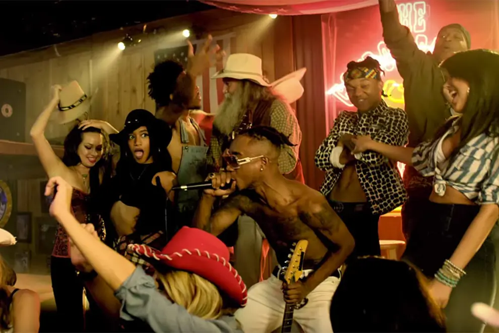 The clip starts with the saloon owner trying to book a country singer named 'Ray Shumar' - instead, Mississipi's finest twin talents, Rae Sremmurd, show up, and mayhem breaks loose - the barn dance gets quickly ditched for some more raunchy behaviour, as the girls in the crowd start riding mechanical bulls and dirty dancing, and the boys start throwing out some of their famous 'hunnid dollar bills'. The owner gets on the blower to the booking agent, mad as a cut snake "Bobby, you told me Rae Shumar was coming, ain't none of these boys Rae Shumar! I don't know who they are, Shammer, Dammer, Rammer! It ain't gonna work for me!" and tries to throw Slim and Swae out but he's quickly outvoted by a hundred gyrating women, and a few silver-haired cowboys all getting swaggy. There's horses, there's baby pigs, there's boots, there's riding crops...just watch.