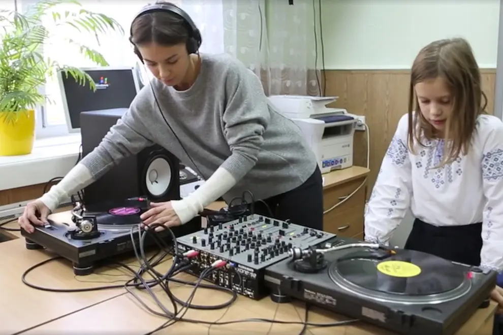 "Last friday before autumn school holidays have started in Ukraine the teacher of the 3rd class (where my daughter Uli is studiying) has offered to the parents to make last day of lessons about their professions, so she asked me to be one of five teachers. I was not lazy to bring a part of my home studio to the school and talk about DJing. I have explained to the children what is DJing about, who is a DJ, how equipment works and what is the meaning in playing electronic music from vinyls. It was cool to introduce them to the esthetics of wax and give them a try to touch and control my setup. That was so much happy time, emotional and inspiring moments. I will never ever forget this experience and I am very much grateful for our teacher Neonila for an opportunity to talk to the young listeners and maybe dance music lovers or even professional musicians/dj's in the future. Later on I'll share another video where you'll see happy interested kids playing with it as much as they could."