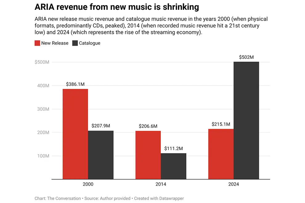 My latest research – which looks at new music releases in Australia from 2000 to 2024 – shows a significant decline in the sale of new music since the adoption of music streaming.