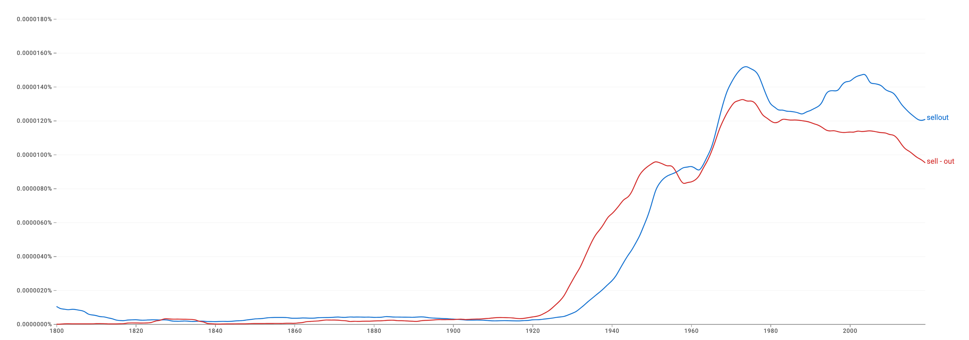 Google Ngram Viewer tracking appearances of the term “sellout” and “sell-out” across their corpus of books