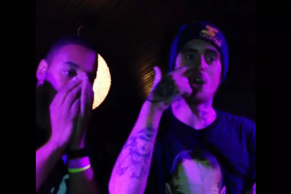 Performing at his official showcase last night, the power went out. So some guy from the crowd jumps up on stage and starts beatboxing. Video proof below: