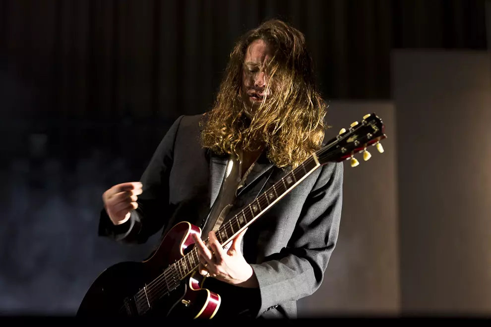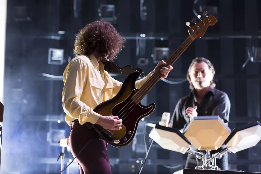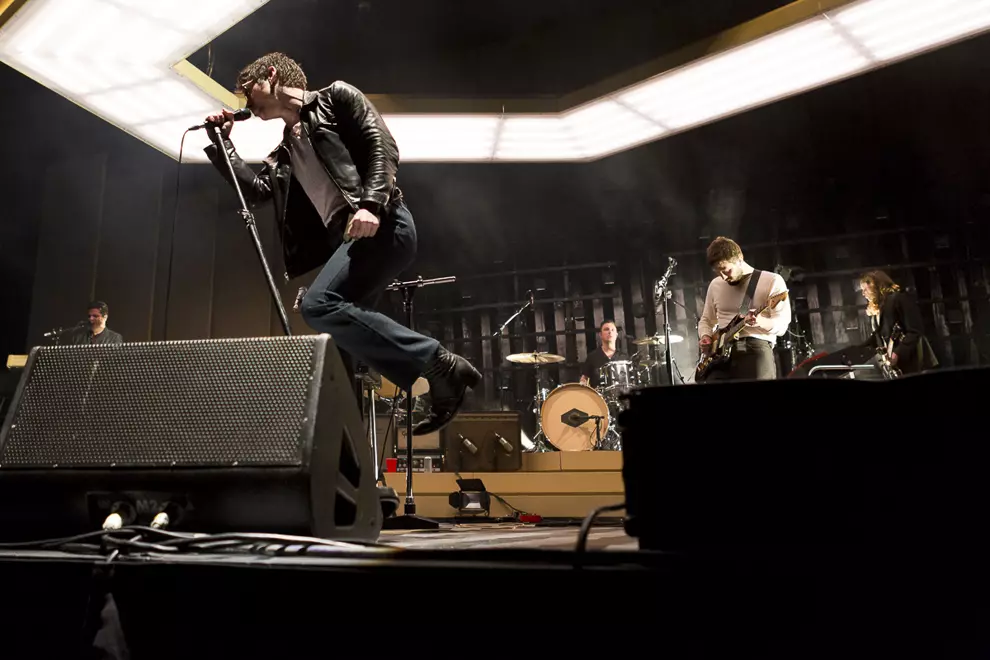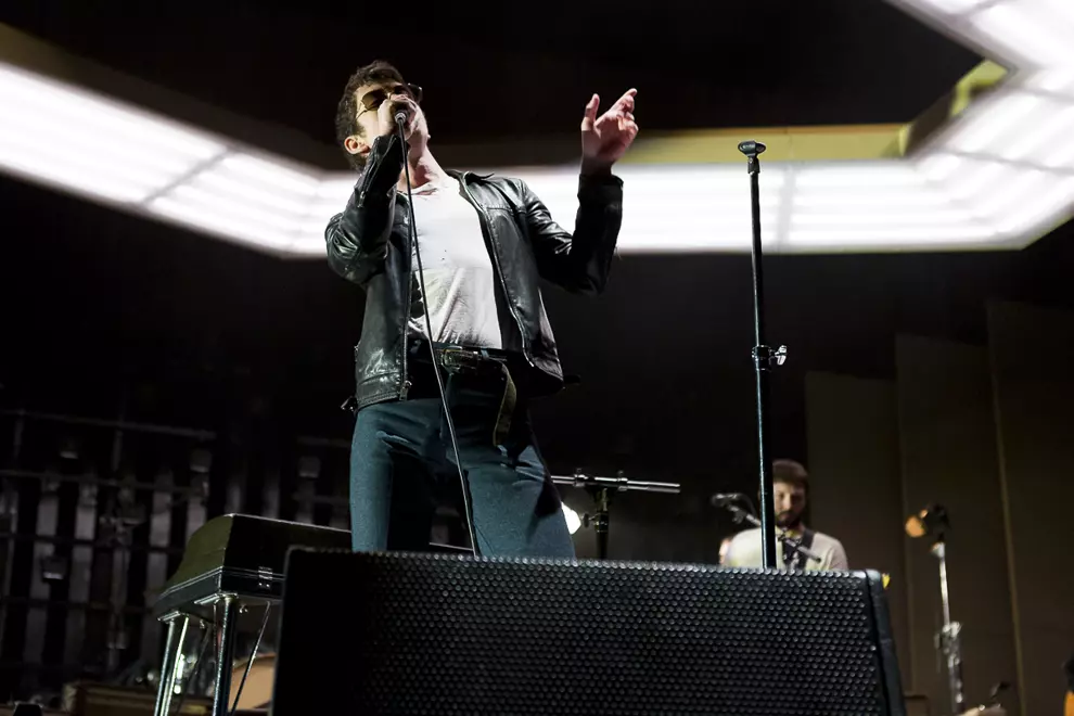 It was no shock Arctic Monkeys’ set design would follow on from their conceptual album. What was so surprising was how similar it looked to the lobby of an InterContinental hotel. Taupe backlit panels with gold trim lighting provided the main backdrop for the stage, along with with a hexagonal pendant light that dropped slowly from the ceiling upon commencement of the show. Muted neutral tones are hardly rock’n’roll but with the commencement of Four Out Of Five it fittingly all made sense.