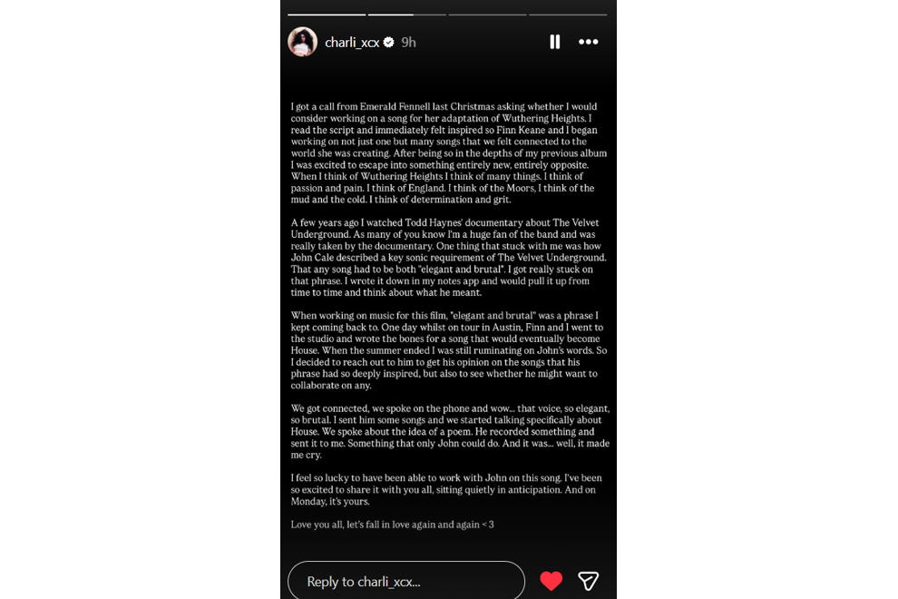 In a lengthy statement posted on her Instagram Stories, Charli XCX explained that she continuously returned to a phrase John Cale used in a Velvet Underground documentary: that songs had to be both “elegant and brutal”—an inspiration she took with her for the Wuthering Heights soundtrack.