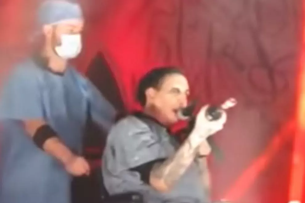 As TMZ reports, the 48-year-old frontman, performing in a wheelchair while recovering from a stage injury in September, aimed a fake semi-automatic weapon at the crowd at the Glen Helen Amphitheater in San Bernardino during his song, WE KNOW WHERE YOU FUCKING LIVE, with a microphone attached to the end of the prop.