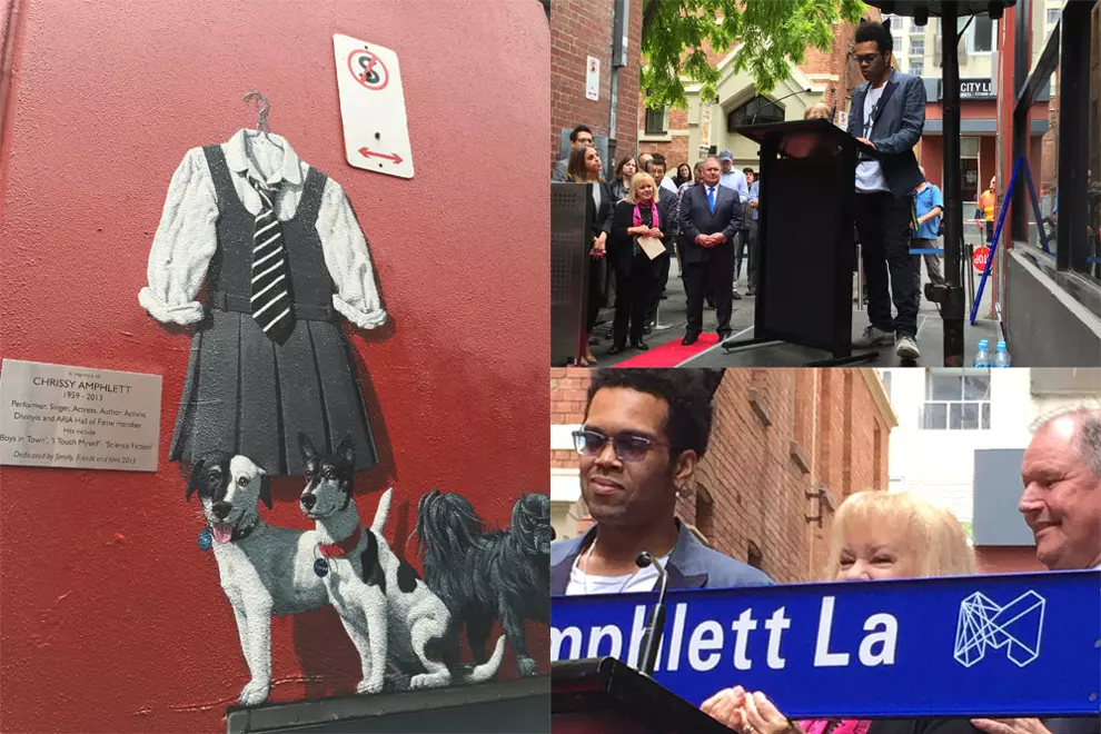 Amphlett Lane, formerly Corporation Lane 1639, is off Little Bourke Street in Melbourne's CBD, nestled behind the Princess and Palace theatres. Red carpet has fittingly been laid down to make the occasion and a mural by Peter Gouldthorpe – featuring Amphlett's trademark school uniform, beloved dogs and a Divinyls amp – marked the spot alongside a commemorative plaque.