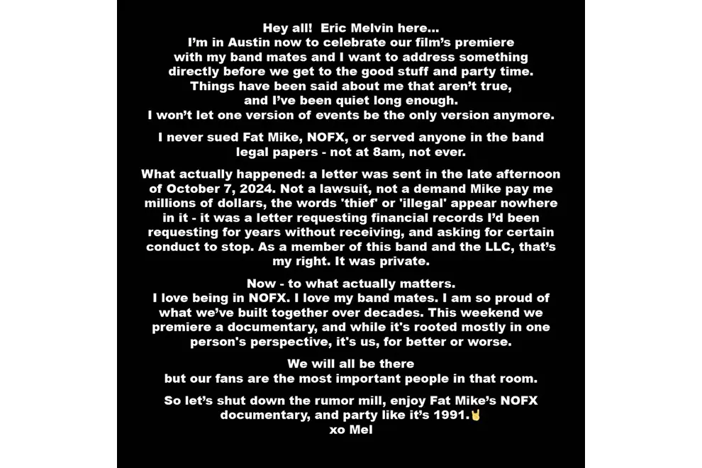 Following the statement, Punknews.org shared a story claiming that Melvin had “filed a civil suit” against Burkett, however NOFX’s longtime manager and sound engineer Kent Jamieson responded with a comment noting that the “story is untrue”, adding that while “Mel has grievances, no suit has been filed.”