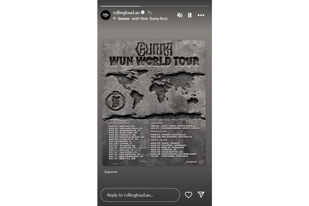The Rolling Loud Australia account shared the tour poster on its Instagram Stories, and, in addition to that Story, the official Rolling Loud account and its founder dropped some hints in Gunna’s comment section.