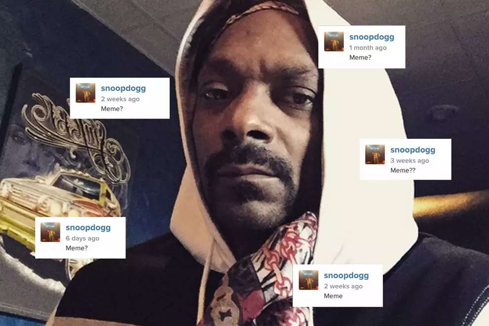 It's an odd phenomenon, but every so often, Snoop throws out a casual "Meme?", or the slightly more hilariously desperate "Meme??", to his followers, alongside an often unusably grainy selfie, apparently out of some desire to see his picture sent back to him with some kind of snappy one-liner written in black-outlined white Impact font but, then again, maybe he's just fucking with us.