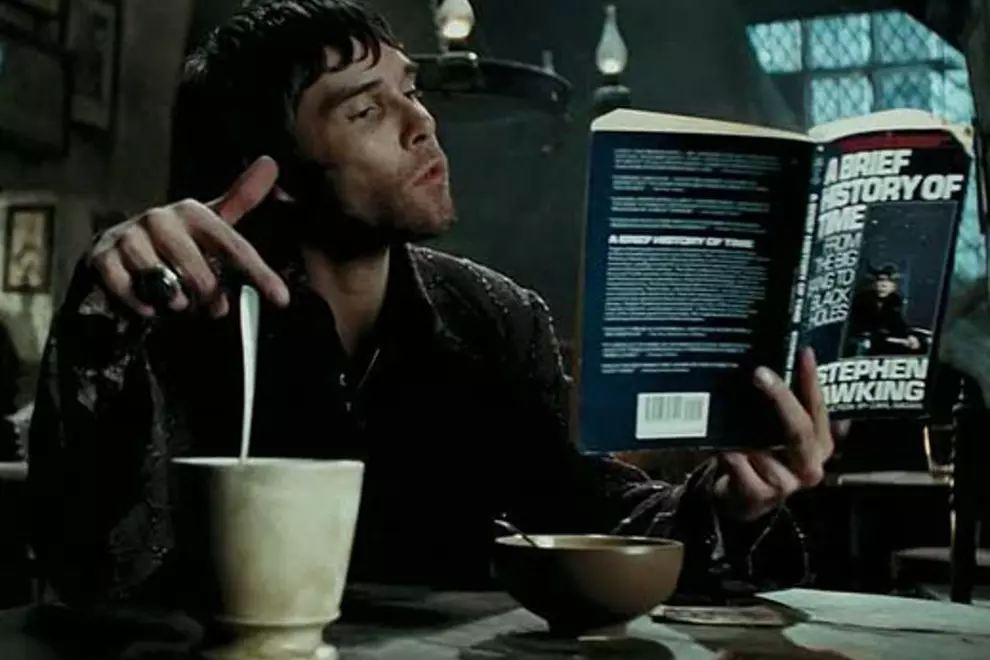 Also, the wizard is reading A Brief History of Time by Stephen Hawking, suggesting a) he is intelligent and b) he is familiar with the Muggle (non-magical) world. So, really, had anyone actually bothered to ask this incredibly powerful, smart and worldly wizard for his help in combating Voldemort and his followers, he probably could have saved everyone a lot of time and trouble by suggesting they use another kind of wandless magic – namely, a hail of bullets.
