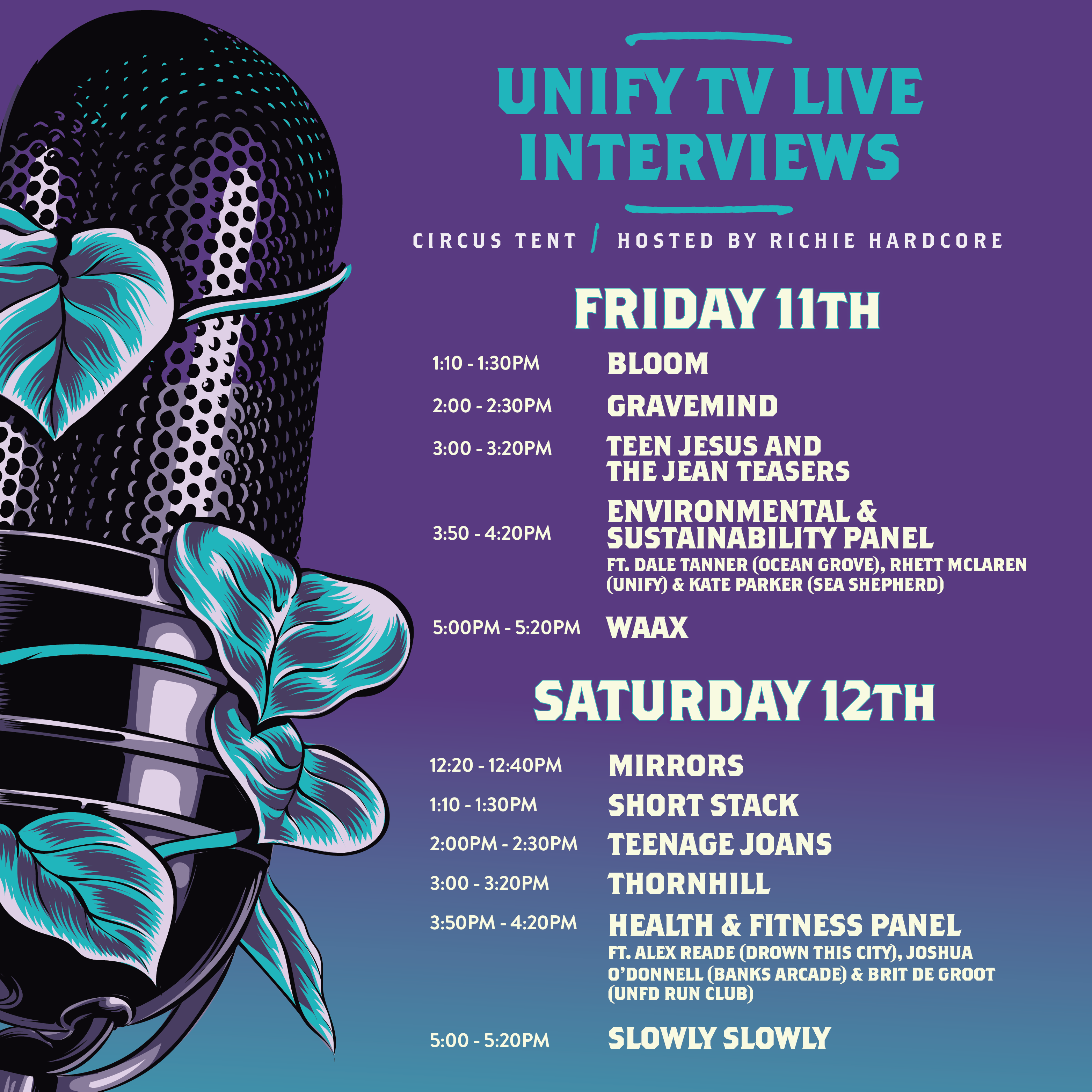 Interviews with artists include Bloom, Gravemind, Teen Jesus & The Jean Teasers and WAAX on the Friday. Then Mirrors, Short Stack, Teenage Joans, Thornhill & Slowly Slowly on the Saturday.