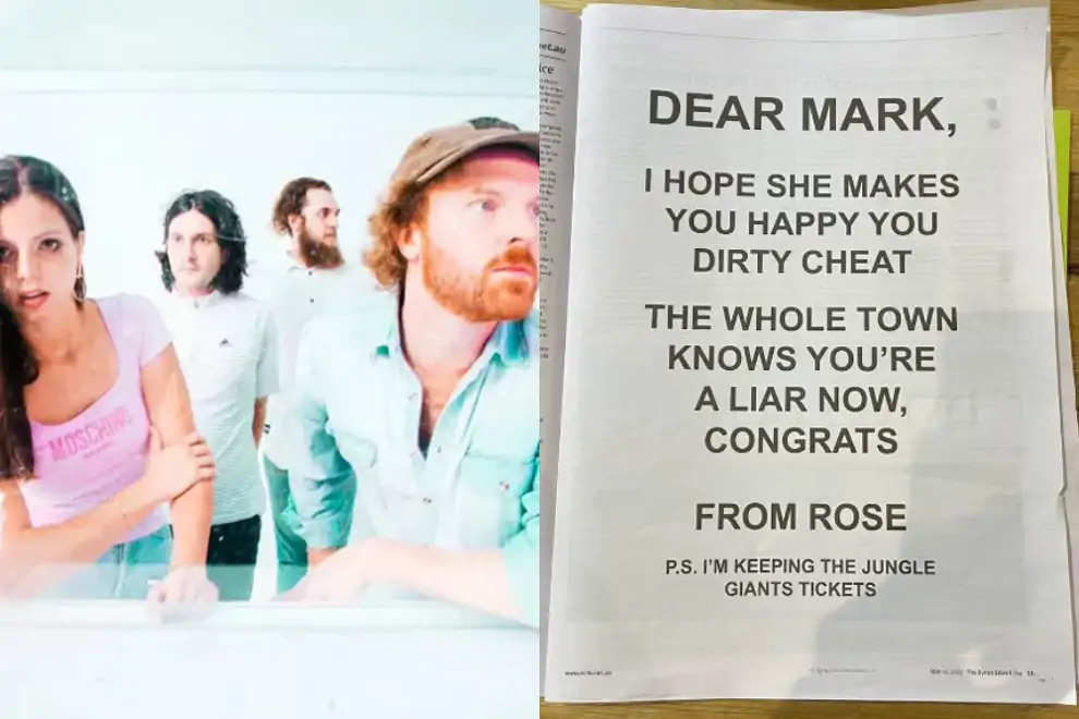 The Jungle GiantsHell hath no fury like a woman scorned, and one Jungle Giants fan has taken revenge on her cheating boyfriend to the next level by posting a scathing message in Byron Bay's weekly newspaper, The Echo.
