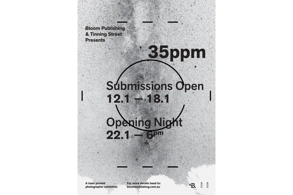 "Bloom Publishing is proud to present their first submission-based exhibition, 35ppm, a print on demand experiment showcasing photographic work from around the globe, produced on site by Bloom's mono laser printer. The exhibition will feature a single A3 print by 30 artists; with each work sold to be printed on-the-spot throughout the entirety of the show."