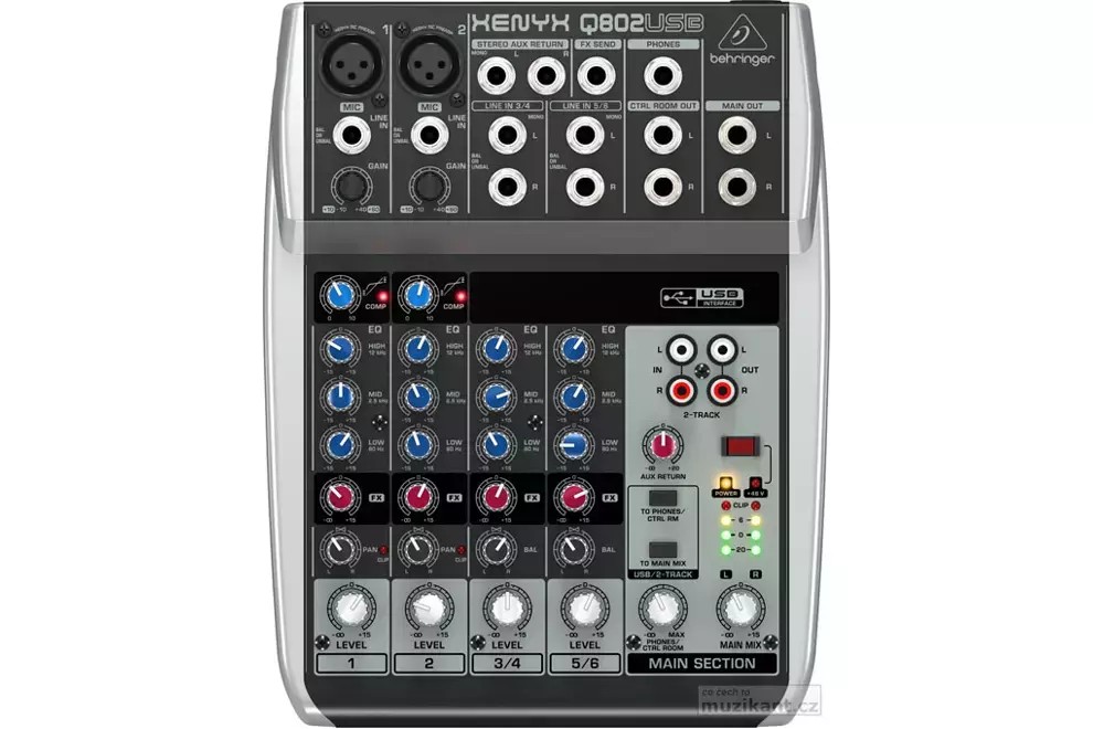 First, the Q 502 is an extremely simple little desk featuring one mono channel and two stereo channels, for a total of five channels. Channel one houses a single Xenyx mic preamp, balanced/unbalanced input, gain control, compression, phantom power (for a condenser mic/active DI box), two-band “Neo-Classical British” EQ (based on legendary British consoles of the '70s and '80s), pan and level. Then channels 2/3 and 5/6 are identical with two ¼” balanced/unbalanced inputs, balance (pan) and level knobs. Very simple stuff. The Q502 also has USB out so it can send and receive two channels of audio in and out of your computer, like a basic audio interface. So essentially, you have the option of using it as either a live mixing desk, a recording preamp going into an audio interface, or even a basic audio interface itself.