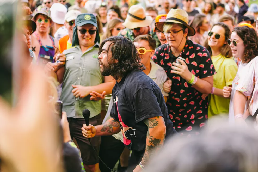 Down in the main amphitheatre on the triple j stage, Adelaide’s West Thebarton are making the most of their early set as one of the few rock acts on this year’s bill. "Reverend" Ray Dalfsen commands his seven-piece with the infectious energy, jagged vocals and self-deprecation they’ve become known for. Tidy yet chaotic, hits like Tops, Stuck On You and Bible Camp go down a treat.