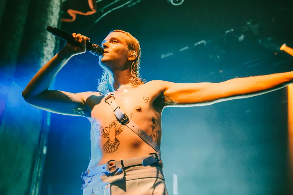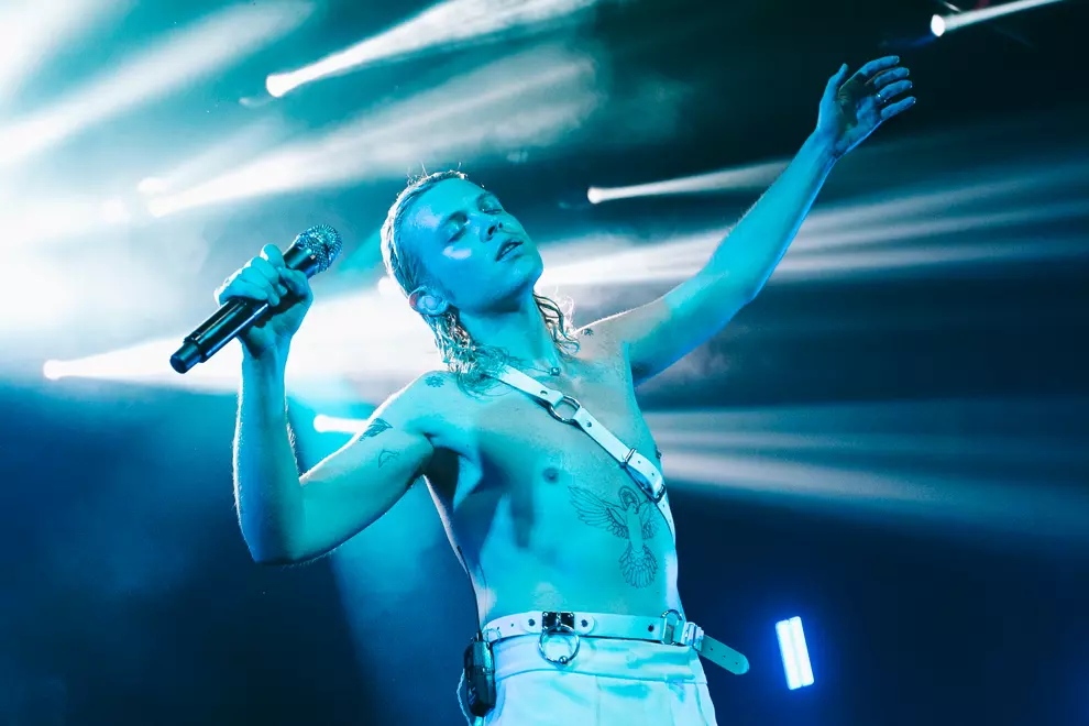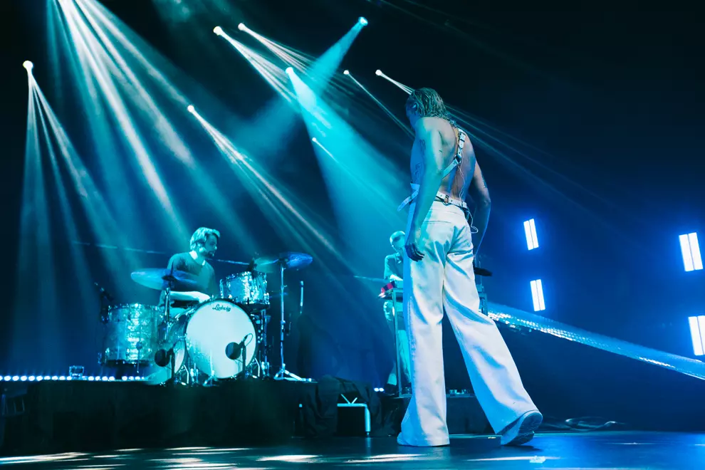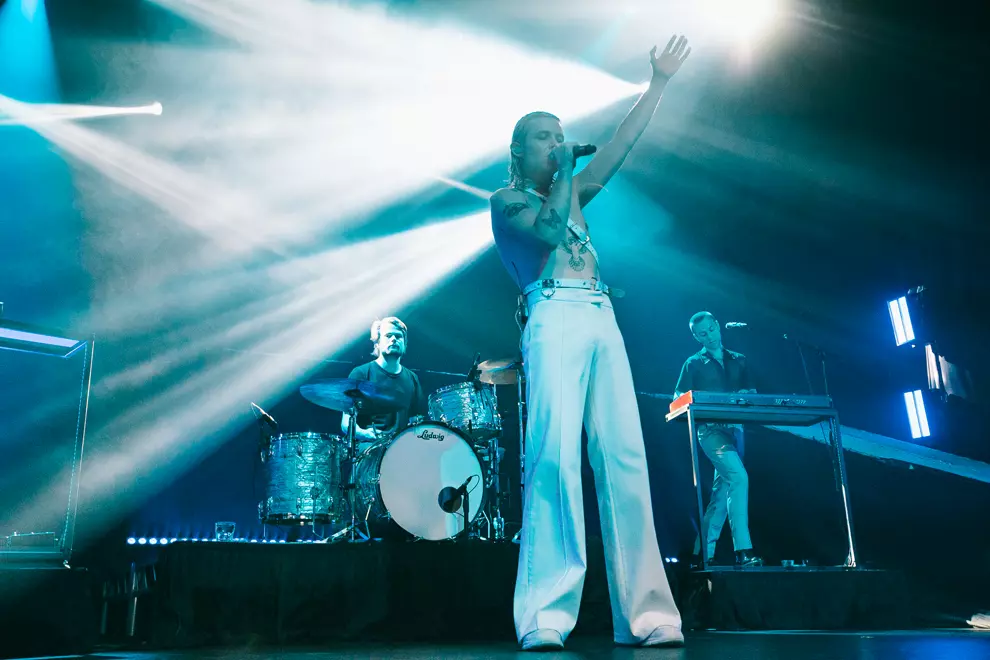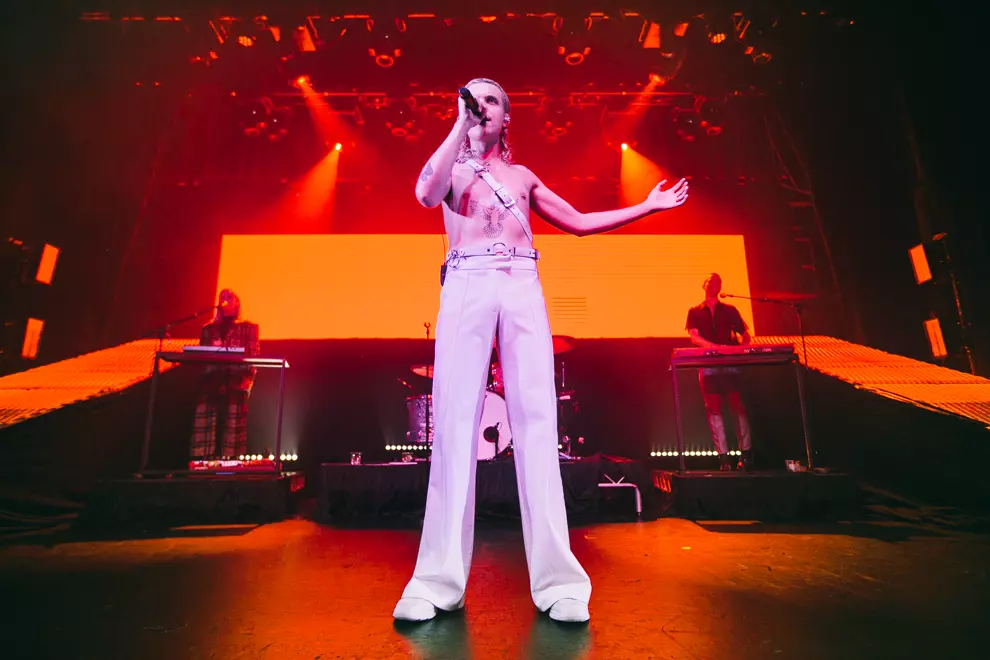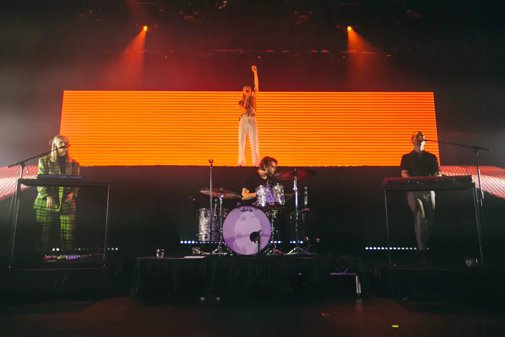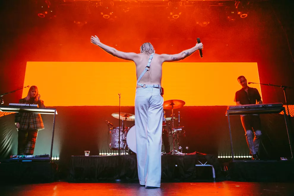 Opening with synth pads through the PA and ominous lighting, the band's fashionista icon Tim Nelson strolls on stage for a vocal solo of Unwinding Myself to welcome us to the evening. As Nelson fades back to the black and the curtain drops, the colossal stage set-up for Cub Sport is revealed. A platform loops around the back of the stage with a huge light panel that makes us feel like we are at a stadium show for Drake. It's all accompanied by massive light displays side of stage and a goddamn laser show on the roof – what a glow-up for the Cubbies. Singalong Chasin' opens the set proper and the air is immediately filled with phone screens. With the stage set-up and a costume change already in the bank, this show is cementing Nelson as a pop star, the frontman strutting around the stage like an angel. Ethereal in his voice and channelling Florence Welch with his moves, it’s an enlightening experience, especially when Video and Hawaiian Party follow suit. The set does take a major energy drop when a sea of emotional tracks such as As Long As You’re Happy come into the set. This time highlights the love between Nelson and keyboardist Sam Netterfield, each track bringing on the audience love for the two. Footage of their wedding during a lengthy instrumental jam as bassist Zoe Davis shreds centrestage gets some of the most raucous cheers that have ever rocked The Tivoli’s roof.