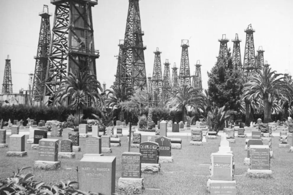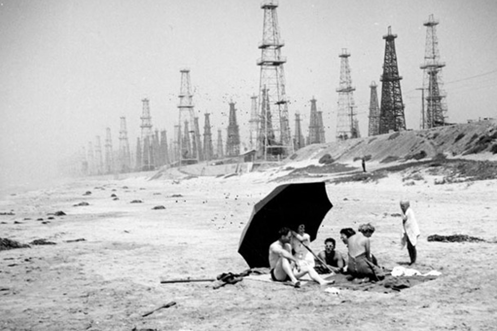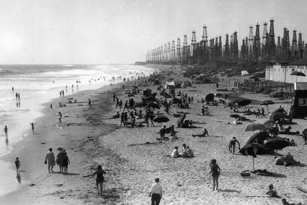 California in the early 1900's; a pristine coastline, beautiful beaches filled with locals and tourists enjoying the sand and salt - all the while draped in the shadows of hundreds upon hundreds of oil towers, viciously pumping black gold from the ground beneath the dunes and inner-coastal suburbs. As an Australian who's never visited the US and really knows very little about California, other than what I've seen on TV and in movies, I'm not sure why it came as such a shock to learn about the Golden State's oil-fuelled history, or why I've found myself so intrigued by it. I guess it's because California, as I know it, is a state built on a reputation of being warm, bright and almost painfully shiny. I hear LA and I think of the sun, the beach, the Hollywood sign; not barrels upon barrels of black sludge and a horizon littered with the ugly machinery that sucks it from the earth.