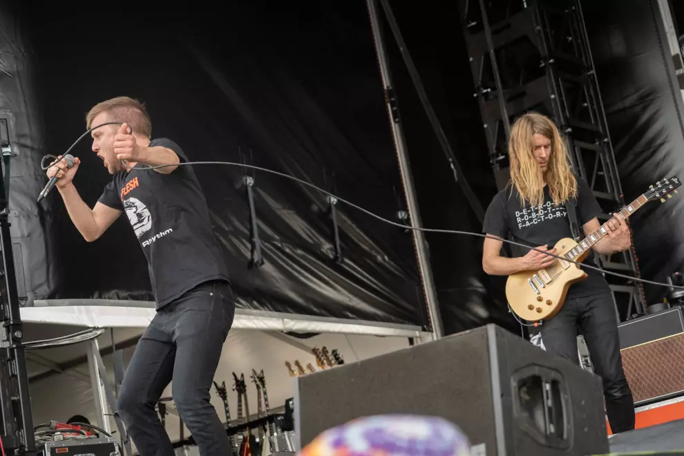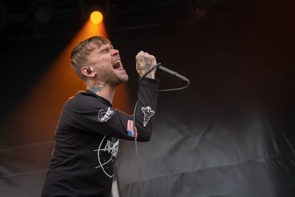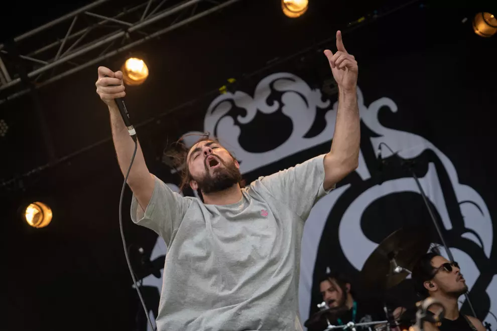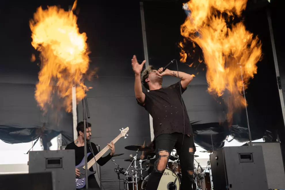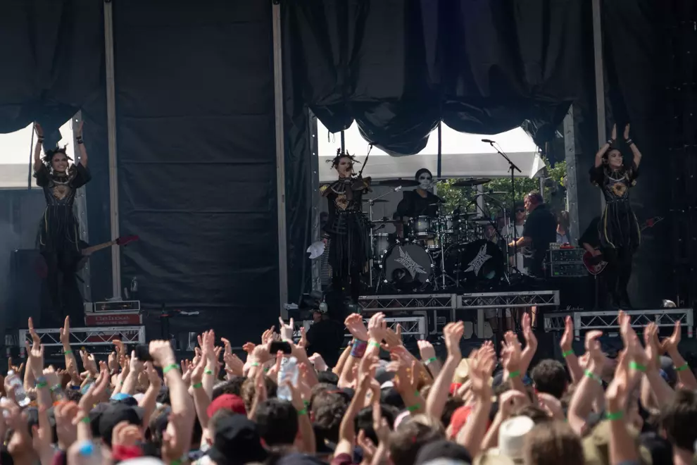 An intense mosh is visible on screen, with others hanging back. The Used lack the more distinctive melodies of Babymetal or La Dispute, but they turn everything up to 11, frontman Bert McCracken noting, “We haven’t got a lot of time.” Soon McCracken is mopping sweat from his brow with a scarf as even the shade can’t quell the strong heat both on stage and off, with punters doing it tough despite the excellent misting stations.