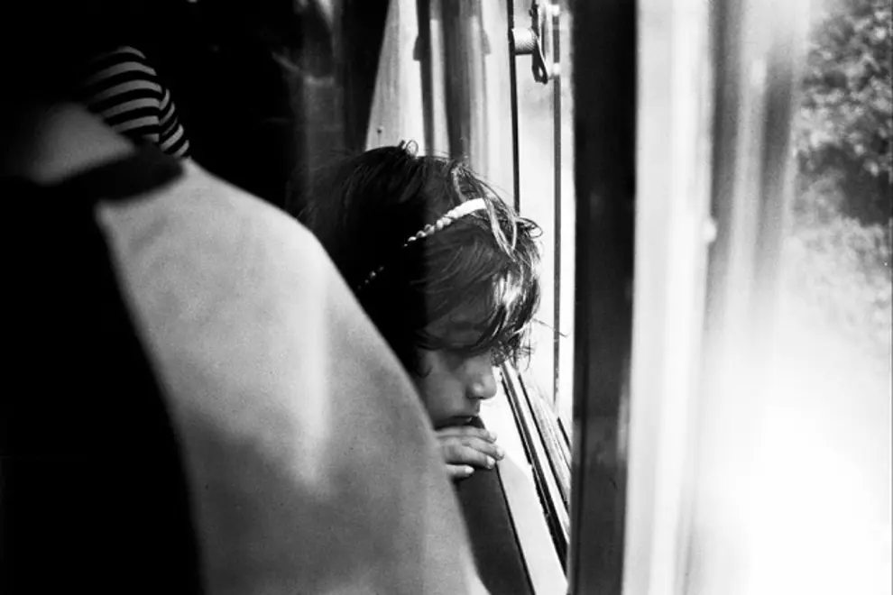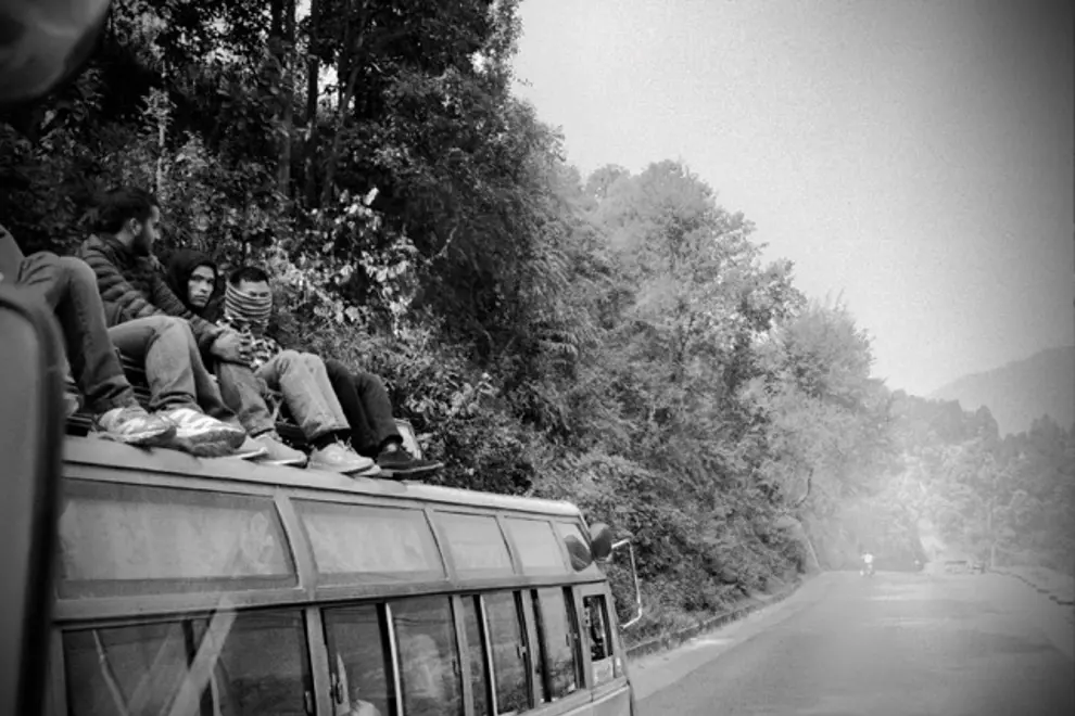 Buses are limited so the men ride on rooftops while the women and children sit below.
