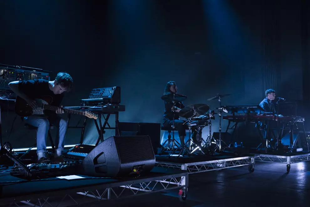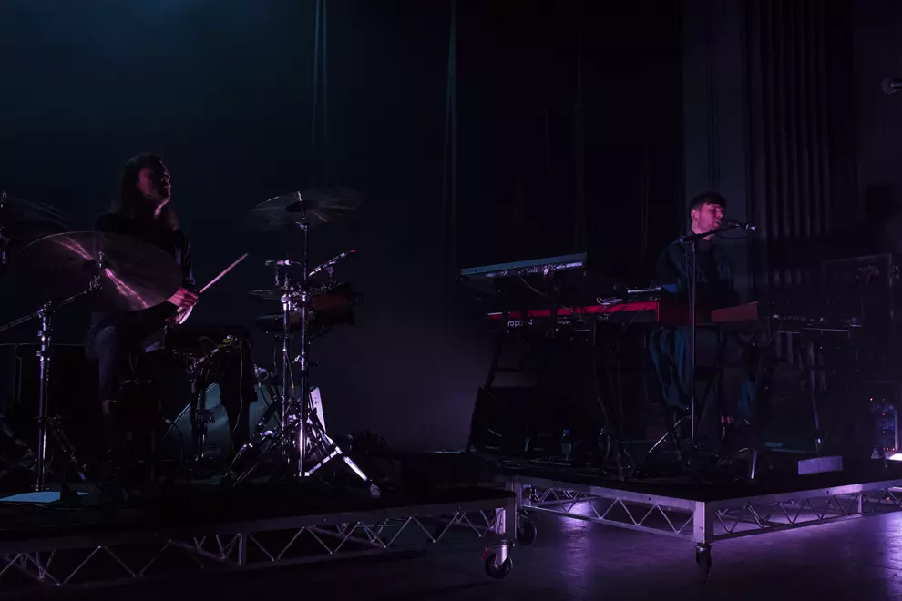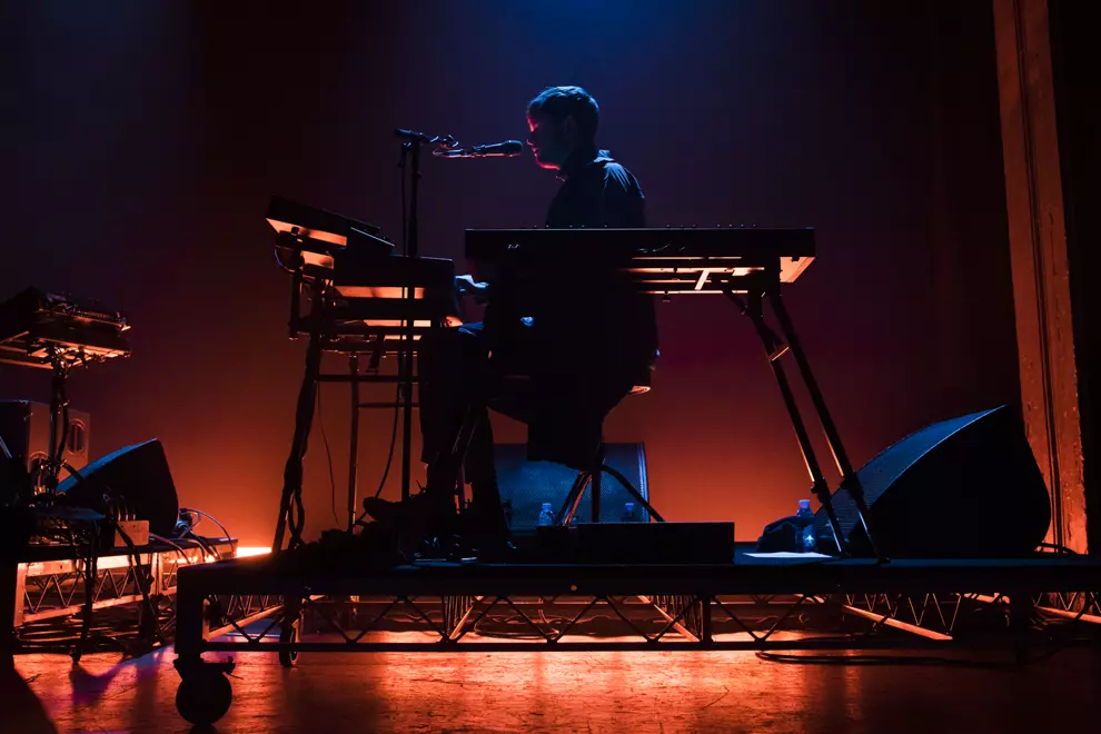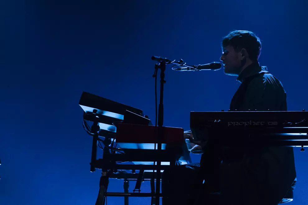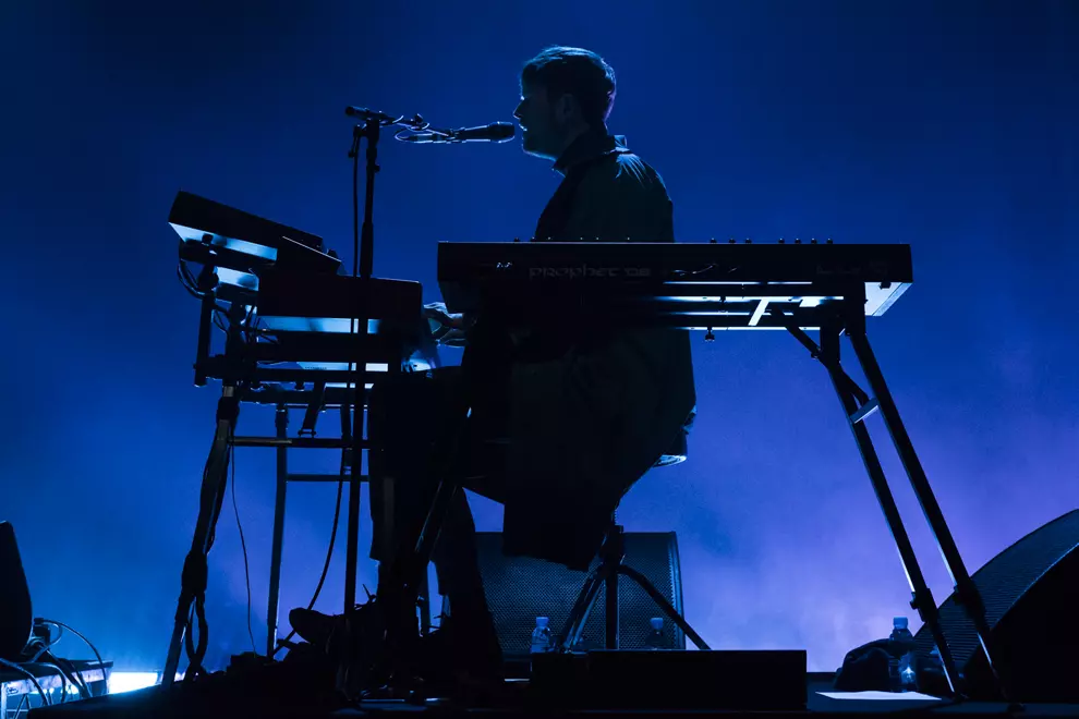 Dressed in a big turquoise coat, despite the brightness and heat of the rapidly flickering light show, Blake performed uninhibited by its size. Rather than trying to hide away, he was often illuminated by spotlights, standing with his hands either by his sides or grasping the mic. During extended instrumental jam-outs, back encircled by his gear, he seemed consumed by the music, nodding along or swinging his legs, barely able to contain his enthusiasm.