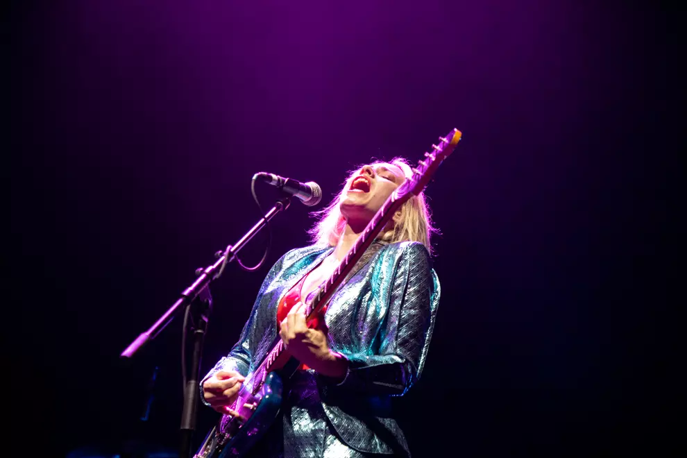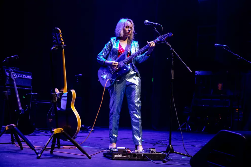 Next up, Olympia's Olivia Bartley takes the stage solo, bearing a stunning glittery aqua guitar that matches the spectacular suit she's wearing. A drummer and bassist creep out in the darkness to join in on her second song. Bartley introduces Smoke Signals as a song we'll probably know and it's glorious, her incandescent vocal effortlessly scaling great heights. Bartley's sustained notes are flawless and her set contains some killer moments, but there are also some flat sections during which we lose interest.