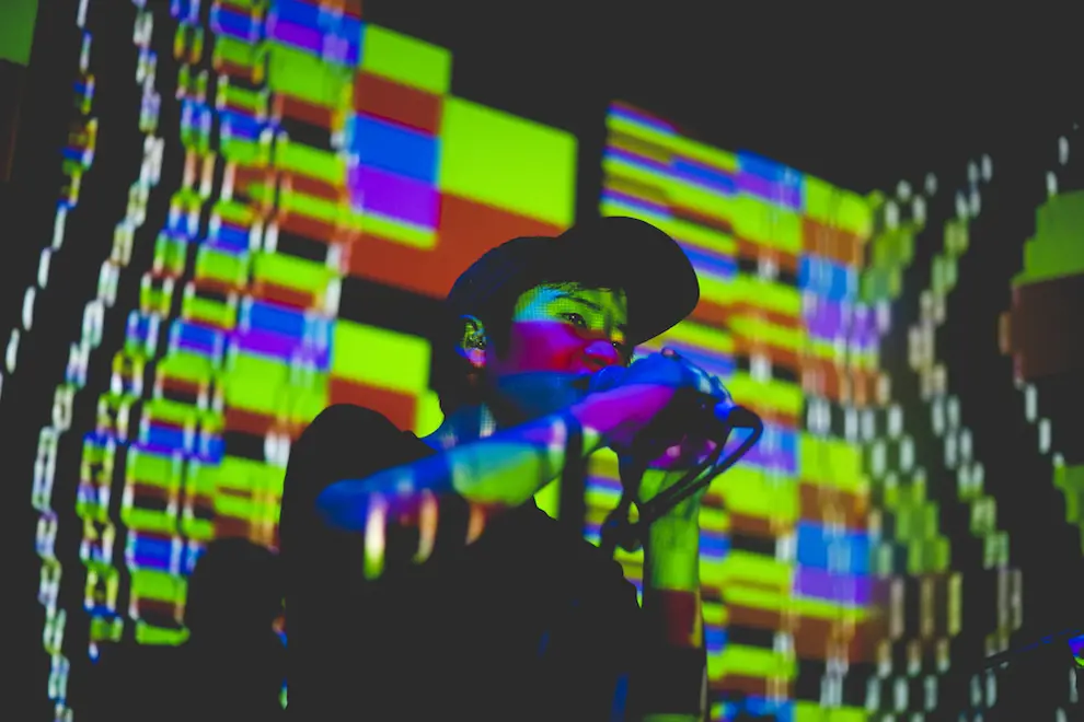 Visualisations are a strong element in our performance. They are there to make everyone in the room feel less self-conscious and have more fun, including Andy and myself. Since my visual artist and friend Greg Hodgson tipped us with the original idea, I’ve designed and upgraded the system over the years with the help of Corey, my brotherly sound engineer. He also operates the system while mixing front of house, so he has a lot on his plate when it’s time to play. When you’re dealing with complex electronic setup like ours, things don’t always go to plan, but luckily he’s an expert in rolling with the punches. I’m very grateful for his hard work.