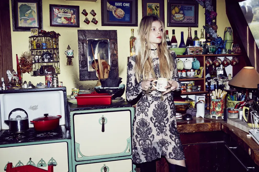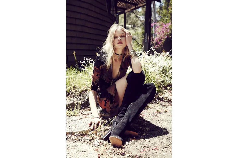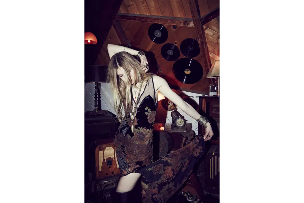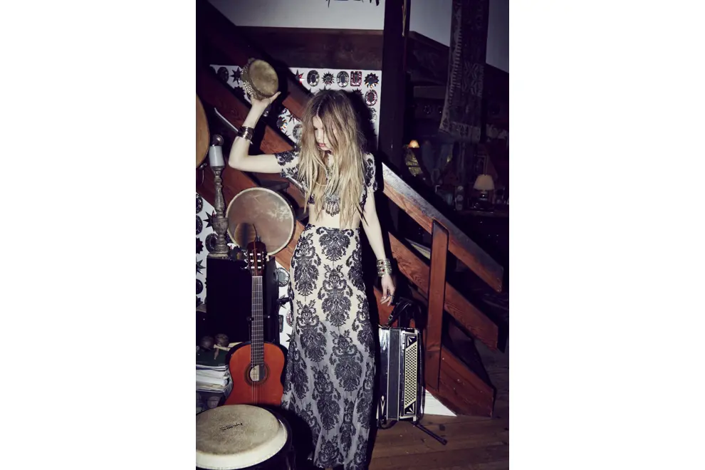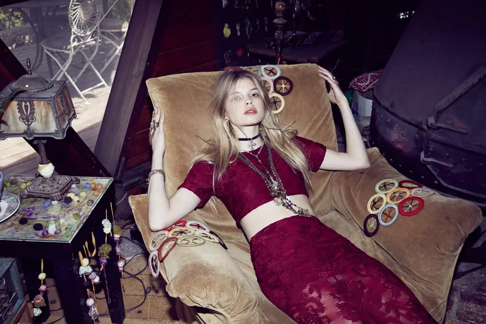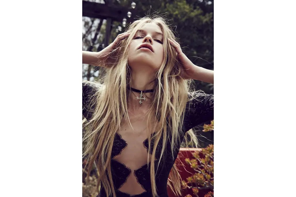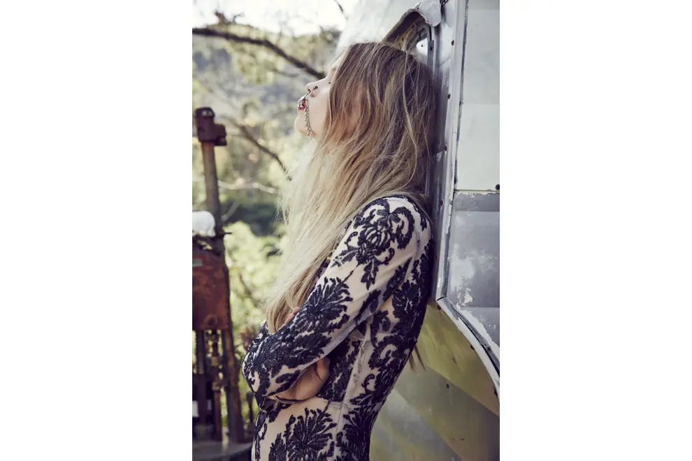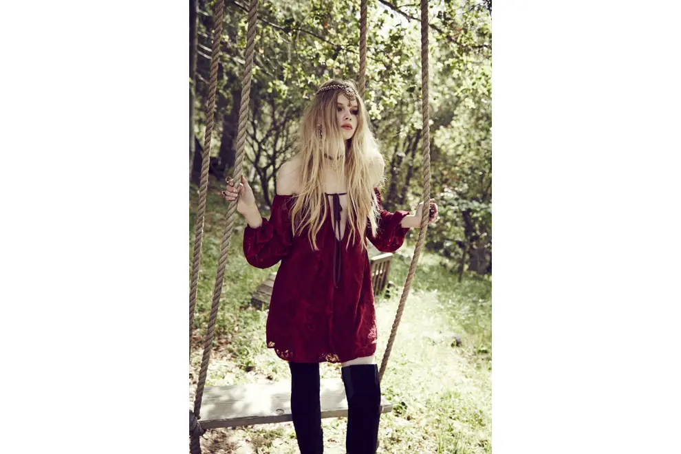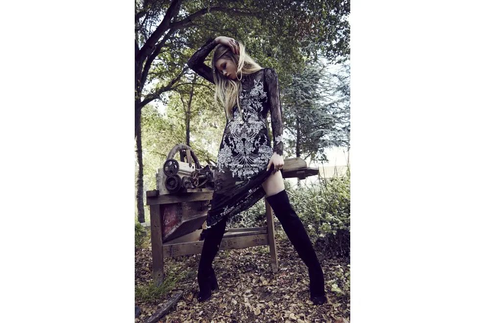 For Love & Lemons' Holiday collection was shot in Topanga Canyon, Malibu. The enchanting cabin and its natural periphery ground the luxurious tone of sheen and sheer effected by a combination of the collection's subtle material with some serious jewels. (And maybe it's just me, but there's nothing quite as stunning as a pretty thing on a wooden swing.)