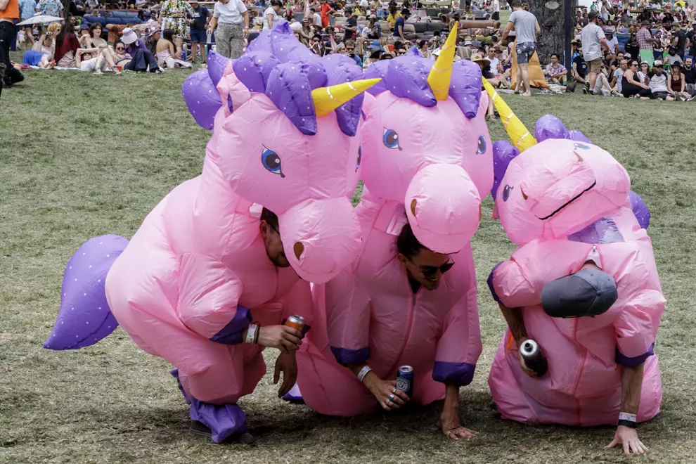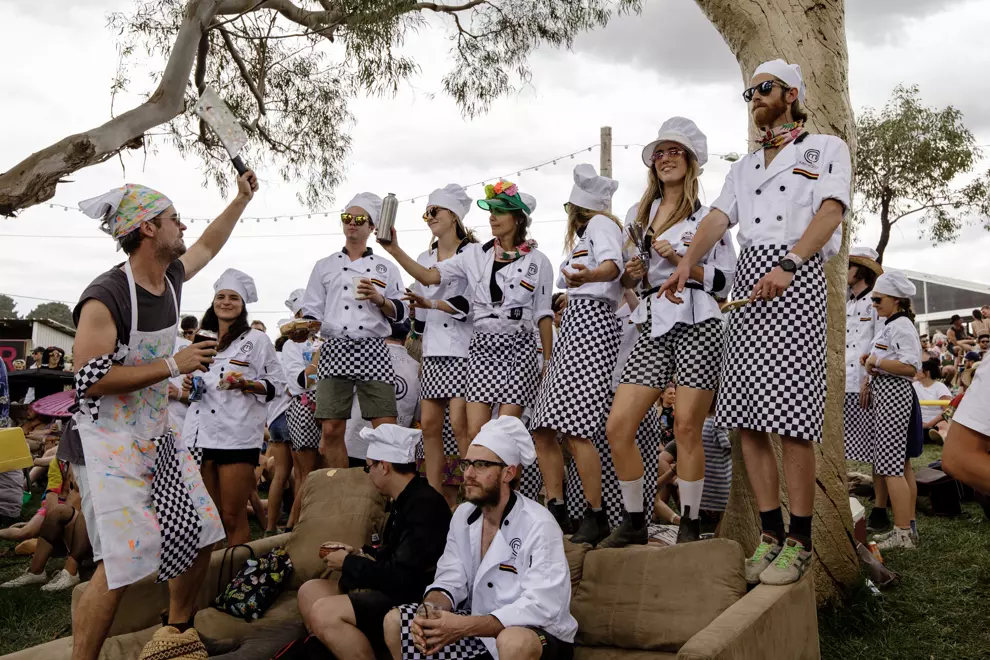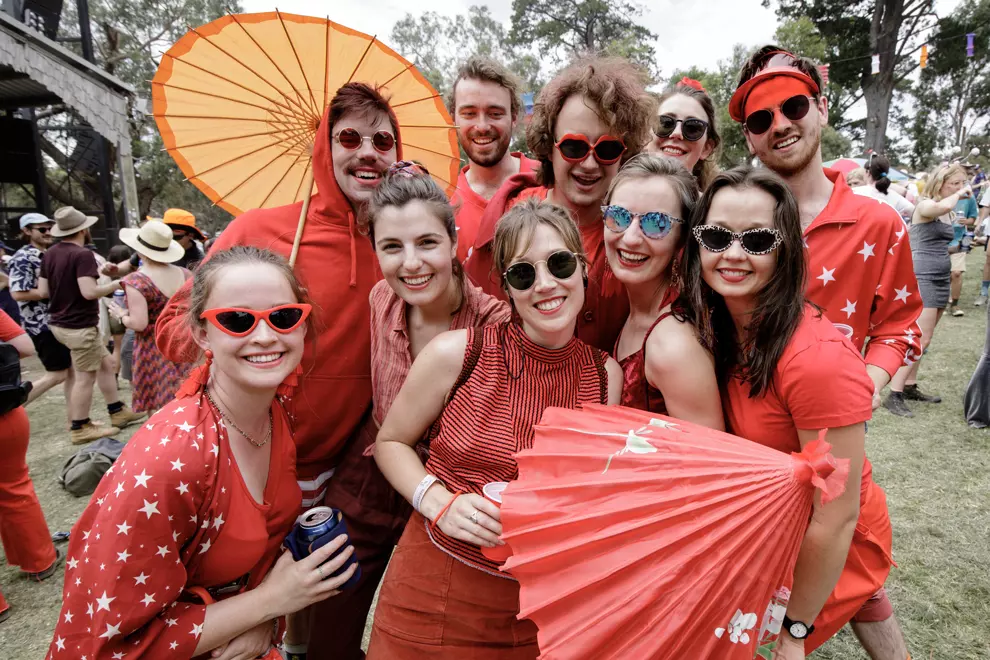 Up on the hill, The Arch Of Love’s leopard-print heart is exchanged for one adorned with fairy lights. This reviewer walks through repeatedly but remains unlucky in love. In the amphitheatre below, there’s a sea of colour and movement. There's really nothing quite like it. While the keenest are down in the pit cutting shapes, makeshift communities have set up around the couches that dot the grassy slope. Some of these couches have bars nailed to their backs and it's impossible not to make conversation – and friends – with the neighbours. Most of the talk is excited chatter over The Breeders. A woman explains that Kim Deal, the Pixies' bassist who fronts the band with her twin sister Kelley, was her inspiration for learning the bass. It's a nice story, but this reviewer is more interested in why so many people have decided to dress as Jim from Jim's Mowing. One man is pushing a lawnmower around the amphitheatre – an outstanding commitment – while a group of maybe 20 have chosen to dress up as 'Jim's Meredith'.