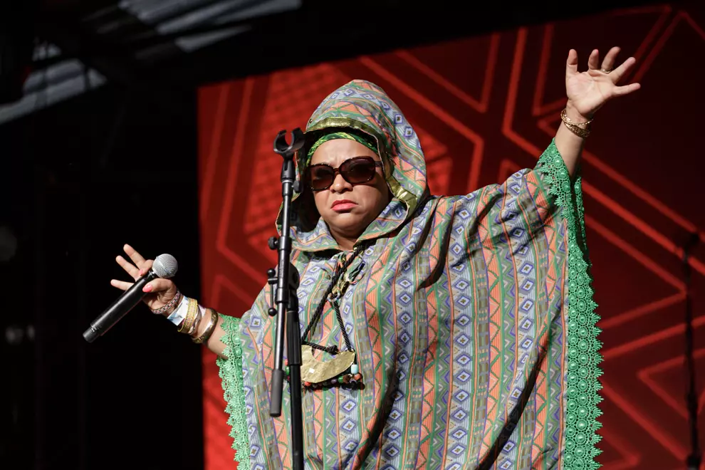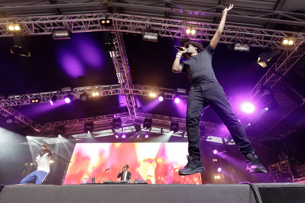 The Pharcyde bolt outta the gates all, "Hell, yeah!” braggadocio, Imani tracksuited-out in bright blue complete with Los Angeles cap in matching hue - all straight out of their packets by the looks of things, trainers and all - but there’s something a little forced about the start of their performance. Then a sample of Spandau Ballet’s True enters the mix and the volume drops out to highlight our rendition. Say what? Did we just hear this tailored call-and-response: "When I say Rizla, y’all say paper!/Rizla!/Paper!/Rizla!/Paper!” This innovation ushers in a Jamming singalong and then, boom! Dirty Harry by Gorillaz, on which The Pharcyde featured - "We ain't got a chance... 'Cause all I do is dance!" - and we're fully vibing. Enter Runnin' and it's laidback and funky. Imani and Bootie Brown ham it up to the cameras so that what’s captured on big screens equates to extreme close-ups of them spitting rhymes. Rather than an encore fake-out, The Pharcyde merely lead us through a, "One more jam!” holler.