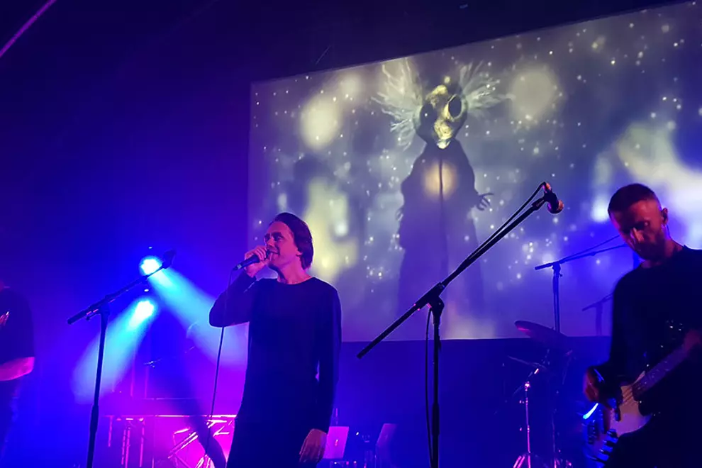 And what a main event it is: Danish alt/indie/art-rock legends Mew, here in Australia for only the second time in their storied career, with new album Visuals in tow. The album was constructed around the visual art and animations of frontman Jonas Bjerre, so, appropriately, most of tonight's songs — even their older material — are accompanied by variably atmospheric and psychedelic projections playing behind the band.
