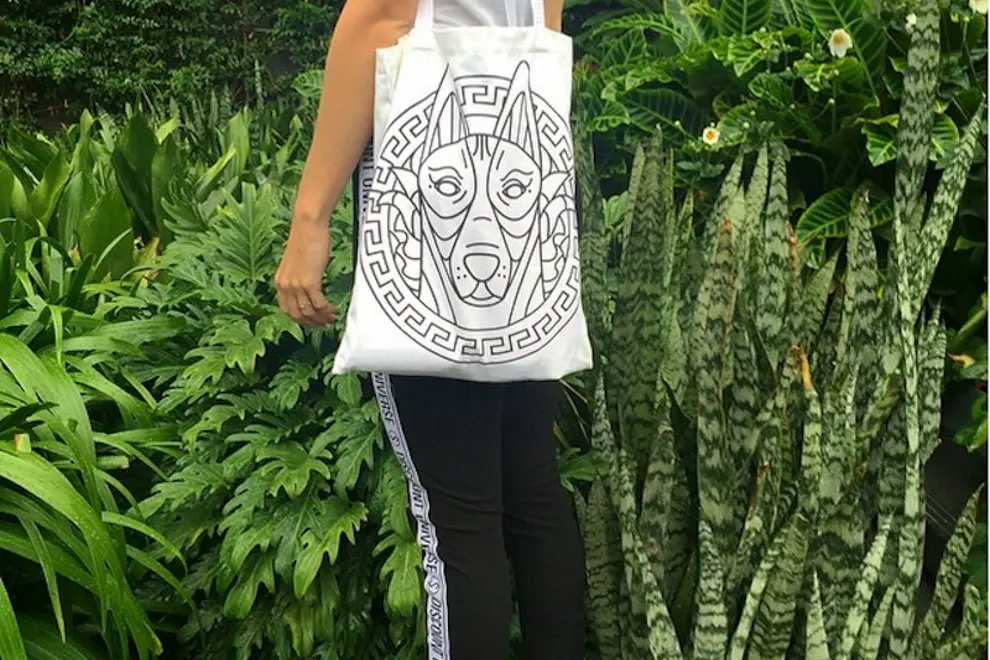Earlier this year I got a limited run of merch made, so limited only two pieces were ever made. This is a photo of a tote bag created by Melbourne designer A-L-C-H with my logo on it being worn by my girlfriend.