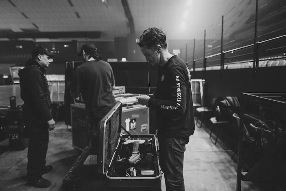 Lucky to watch how the pros do it for the second night in a row - QOTSA sound-checking / rehearsing a new tune up - Homme was crackin the whip ;) fully endorse this method cos ya gotta get it sounding just right. timing is running out though... 15 mins til doors and we haven't even got our gear on stage yet....