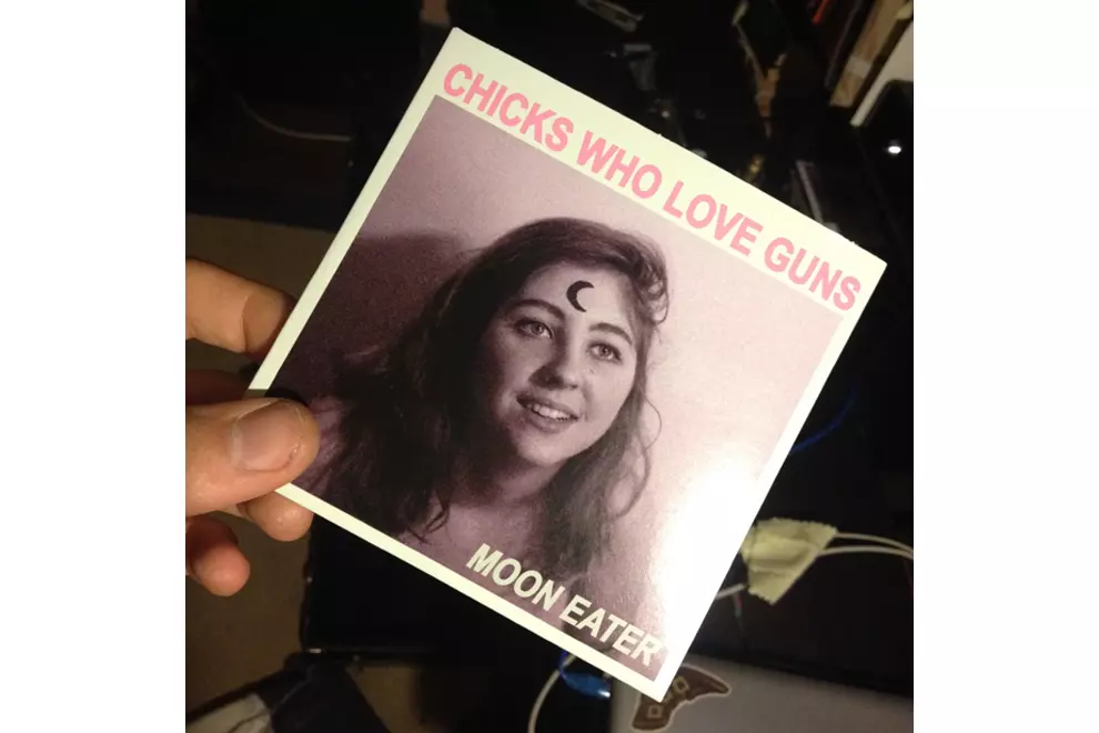 Having thrown the disc into my mac, I had expected my laptop to start buzzing or spontaneously combust though instead Gracenote popped up telling me that there were multiple discs being recognized; one was, Lars Christiansen’s ‘Jetzt Weht Der Wind Aus Norden’, a German single release on Elephant records circa 2003, go figure… The other being CHICKS WHO LOVE GUNS new EP ‘Mooneater’.