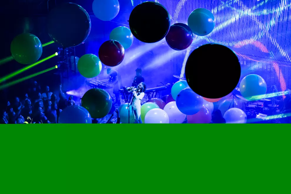 The Flaming LipsPasty limbs peek out from shirt sleeves, bubbles of laughter burst, and the pre-gig soundtrack is the chime of clinking beer bottles. Hamer Hall glows its soft orange glow, and glittering rows of lights lean gently over the stage. It’s a warm Thursday night, and The Flaming Lips are in town to perform 1999’s The Soft Bulletin in full. The time ticks towards the 8pm start time, then past it. Lead singer Wayne Coyne looks out at the audience, looks at his watch, then disappears again. Surprisingly, despite the almost mythical reputation of the band’s live shows, the auditorium is nowhere near full. The stalls are busy, though nowhere near enough to, say, support a fully grown man in an inflatable hamster ball, and the dress circle is half empty. On the upside, the lack of bodies in the circle means diehard punters are able to trickle forward for a better view.