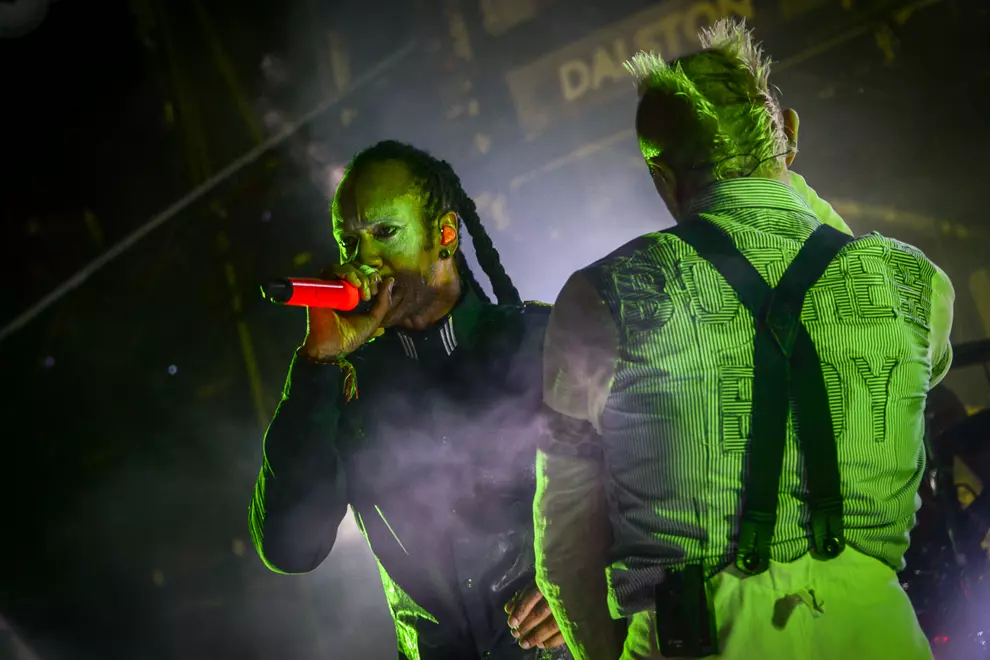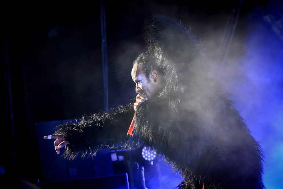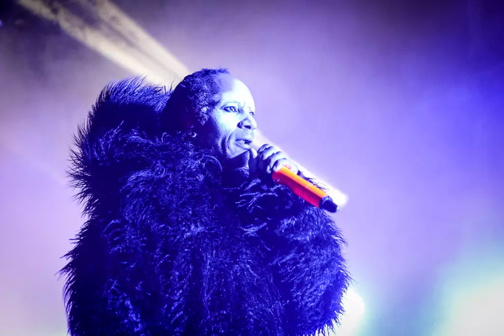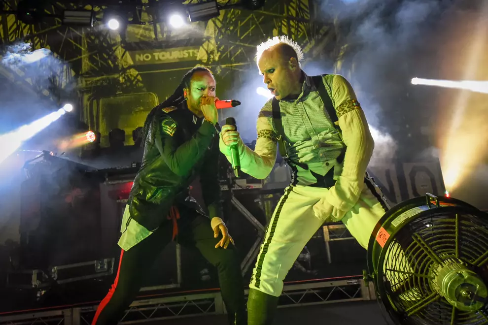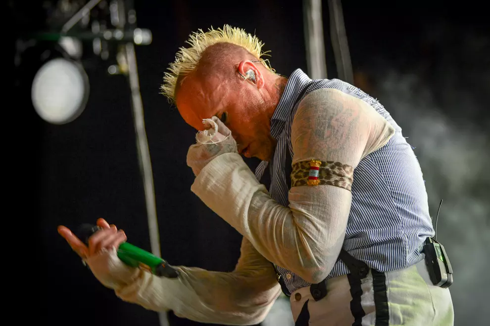 A few hundred people who were previously content presiding over proceedings from atop the hill leg it down to the front, and luckily for them their hastiness is very soon rewarded. A simple changeover has smoke hissing into the damp air and heralds the arrival of the original electronica giants of Essex. The Prodigy have become a well-oiled machine of five players since their humble but noisy start back in 1990. One wonders if age will eventually catch up with manic frontmen Maxim and Keith Flint; they certainly don’t show any signs of slowing down. They pitch the audience into incessant bouncing and air punching with mega-hit Breathe first up, before shedding a full fur suit (Maxim) and white leather with black fringe (Flint) as they launch into Nasty and Voodoo People. Despite Flint’s pierced and tatted flesh and trademark horn locks - on top of raving around like an escaped lunatic - it’s Maxim’s intimidating gaze that draws the eye, especially in crisp chugger The Day Is My Enemy. Flint’s Firestarter is a bit buried under the chaos, but a faultless Light Up The Sky more than makes up for it.