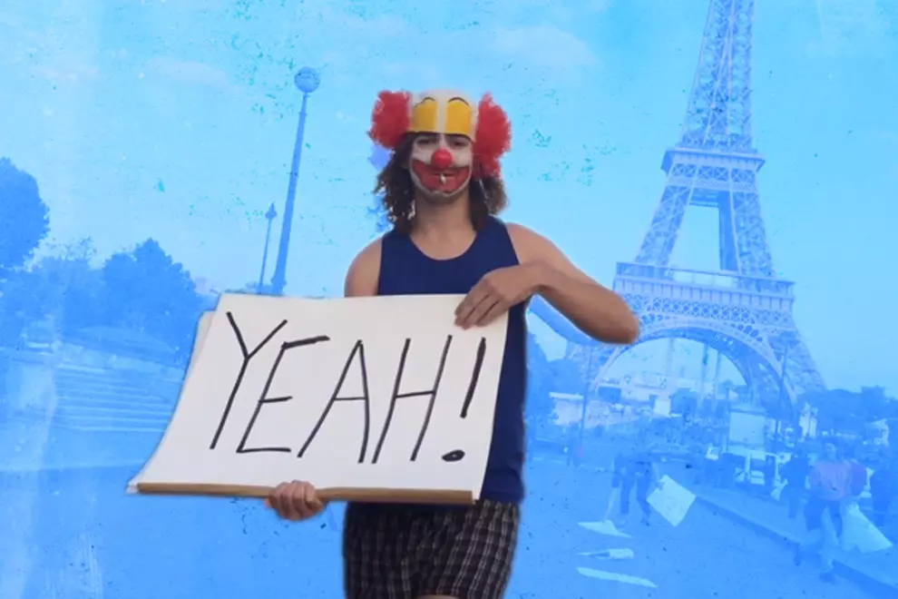 The video opens with an old Parisian silent-movie style header, but is abruptly interrupted by a swift count in from the drum kit. Typical DUNE RATS. We then pan over (I think it’s BC) dressed in a Krusty the Clown-esque head get-up, and to make the sad mime theme a touch more authentic, he’s even got the make-up to match. Throwing cards with the lyrics to the song across a Parisian walkway, they’ve completed the scene by actually filming it in France, where the Eiffel Tower looms above this silent movie.