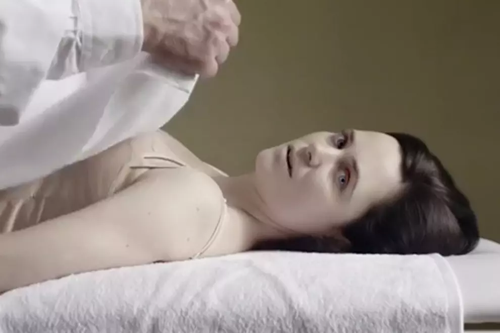 From Carlyle's line of sight, two corpse dressers pull on their white coats and puncture the singer, exporting bodily fluids and injecting some sort of med or botox into her face. From here Carlyle is dressed and beautified with makeup, nail polish and braided hair so that she is presentable for the open casket of her own funeral.